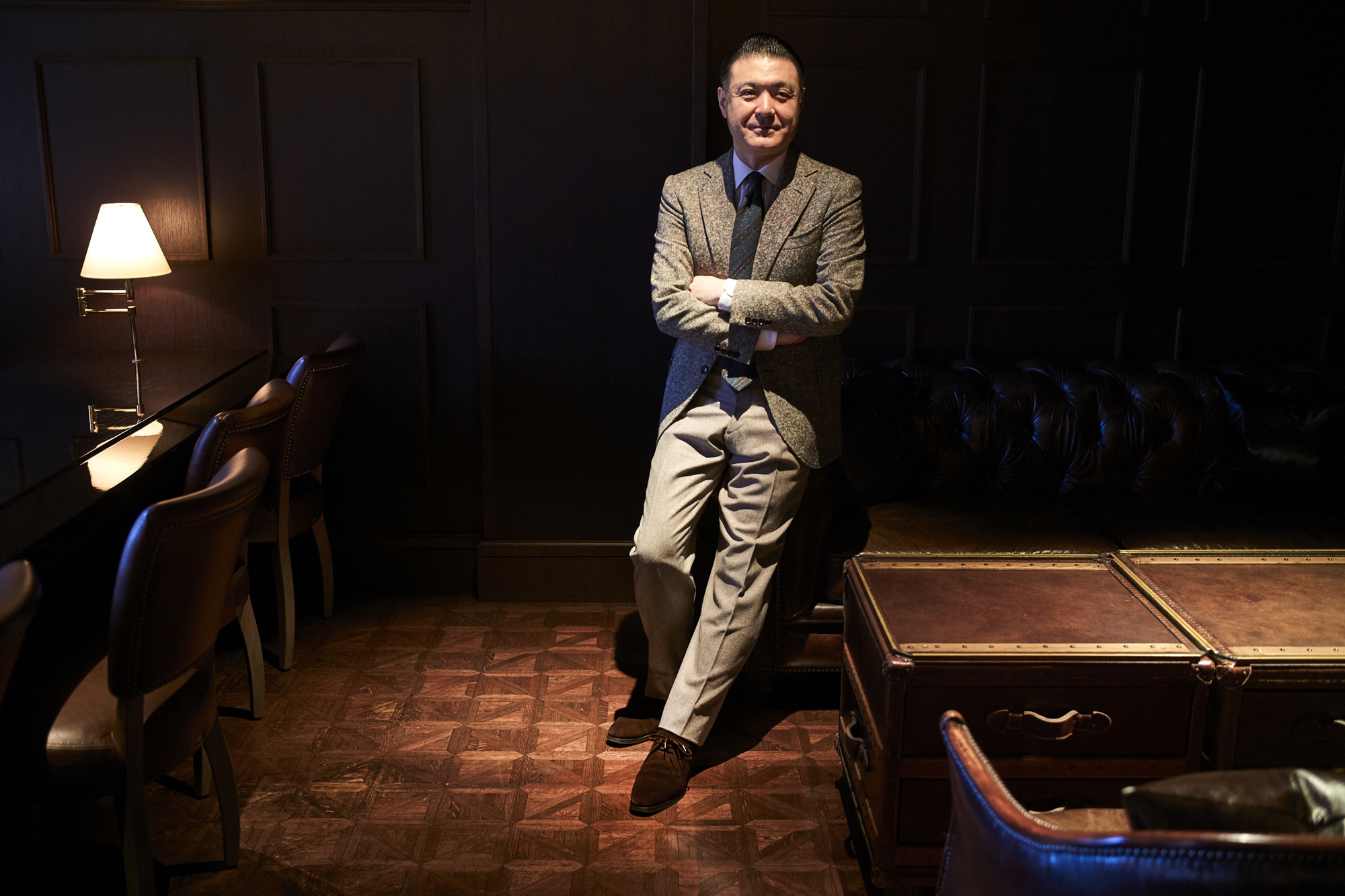 その格好よさに打ちのめされ、太夫はすかさず真似してみたものの、マルセル氏の着こなしには遠く及ばず「ガキにはまだ早い」と諦めたそうです。それから時は流れ、キャリアを積み、憧れ続けたツイードが似合う大人となり、「寒かったからたまたまそこにあったツイードジャケットを羽織りました」風なさりげない着こなしを、今日も太夫は一分の隙もなくキメており(織)ます。