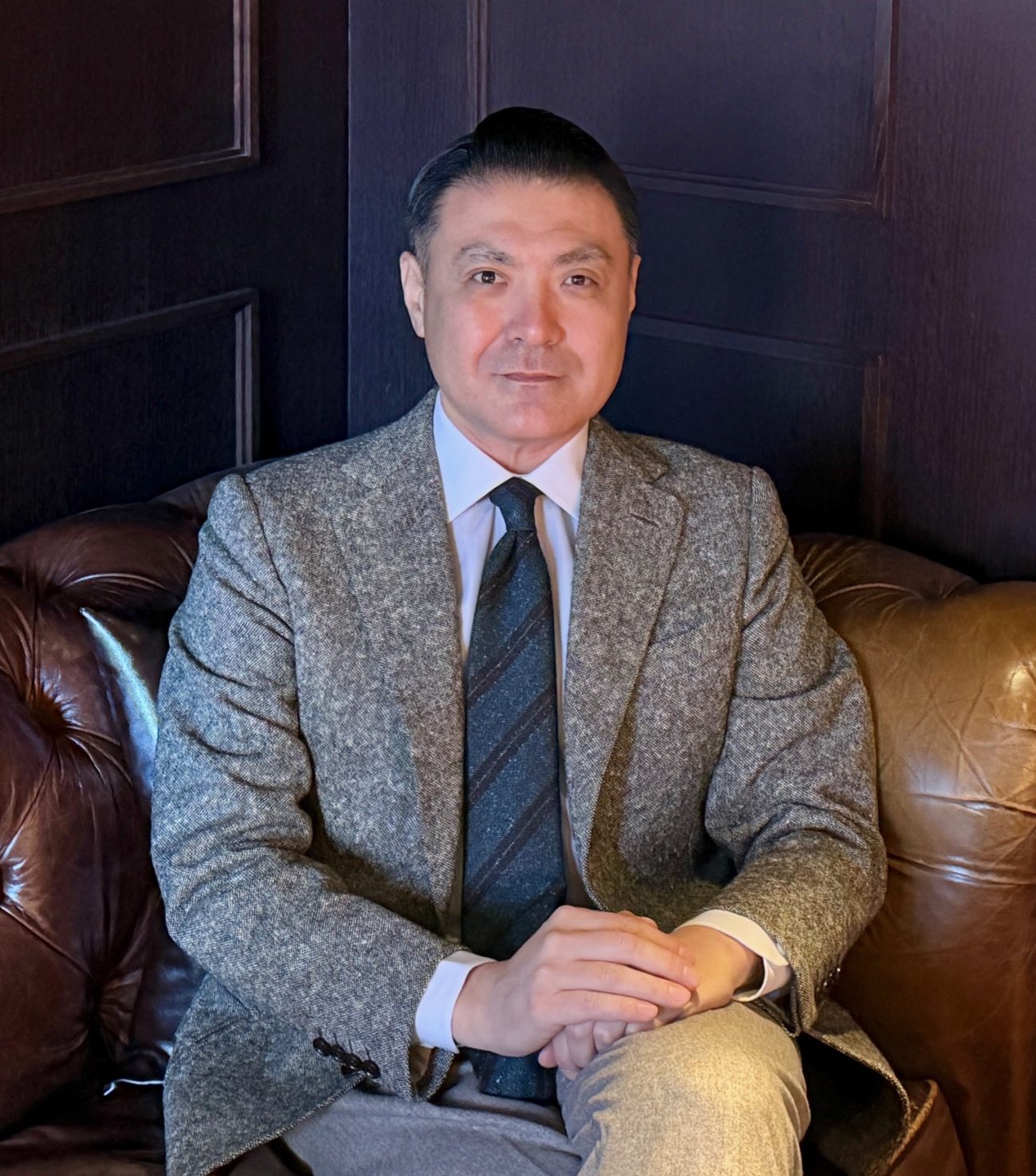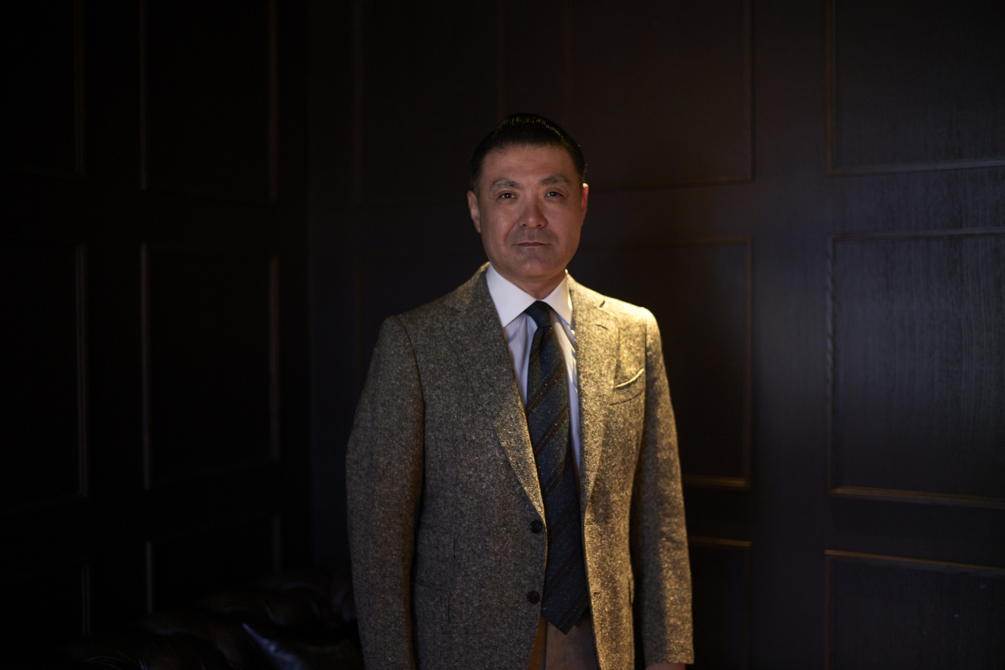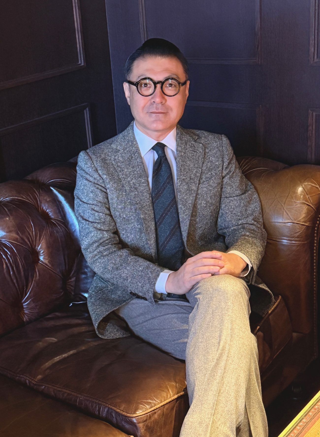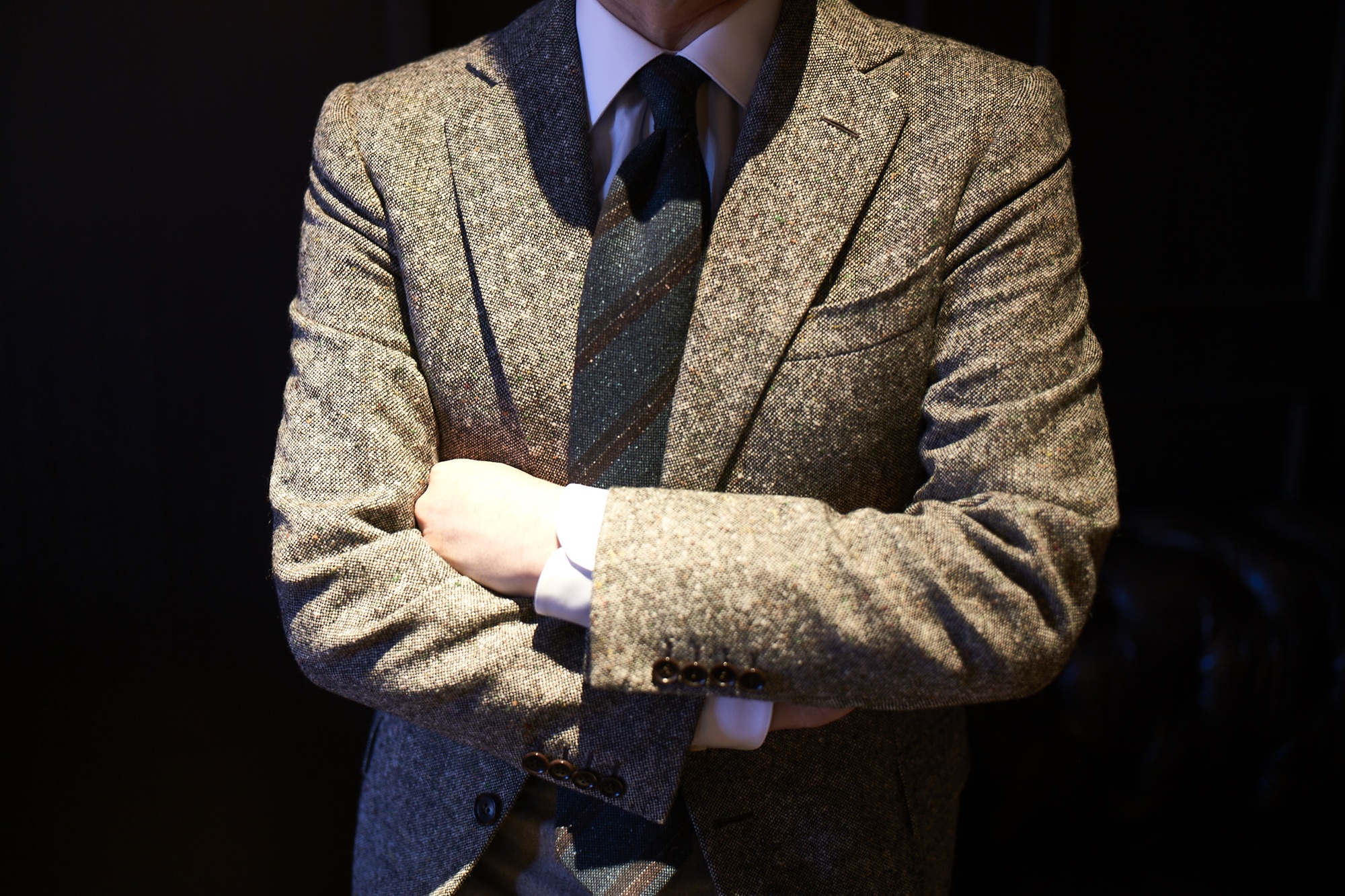 着こなしの主役は、一見普通の「グレーのツイードジャケット」です。しかしよく見ると、こちらのジャケットの素材がかなり厚手なことがお分かりでしょうか。ラペル(襟)がゆるやかに立ちあがって上品な曲線を描いているのは、素材がしっかりと織られて厚みがあるからこそ! なのです。ここまで厚手のツイード生地は「堅そうでチクチクして着るのが大変そう」に見えるのですが、触ってみると実は驚くほどの柔らかさ! 思わずジャケットの袖をにぎりしめて「このツイード生地は、いったい何ですか?」と聞いてみると、われらが太夫は涼しい顔で「ああこれ、ドニゴールツイードなんですよ」とのお答え。