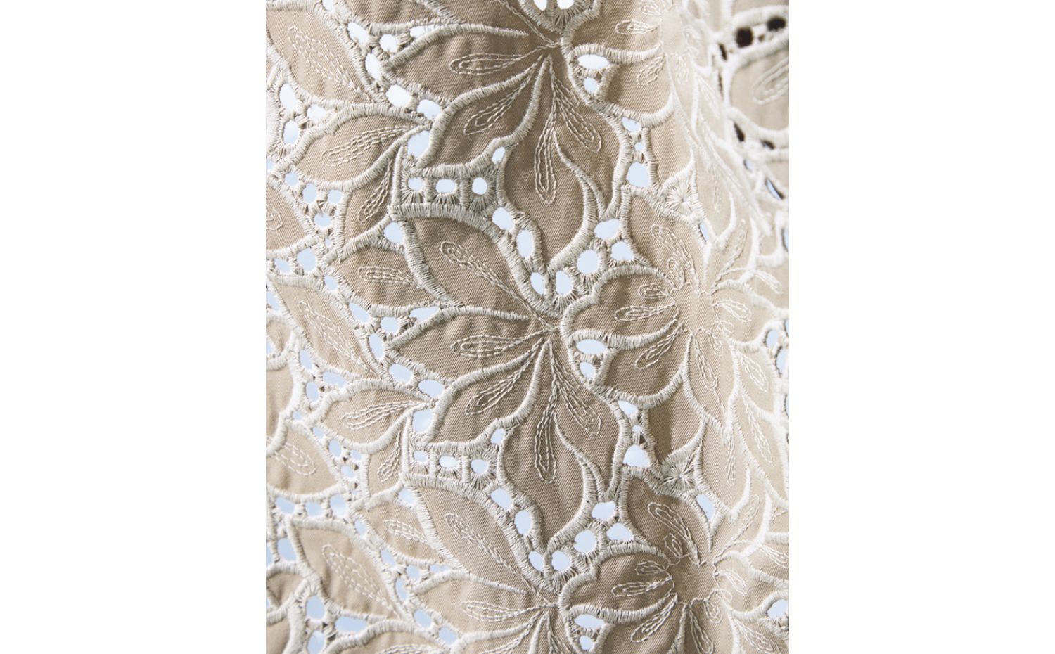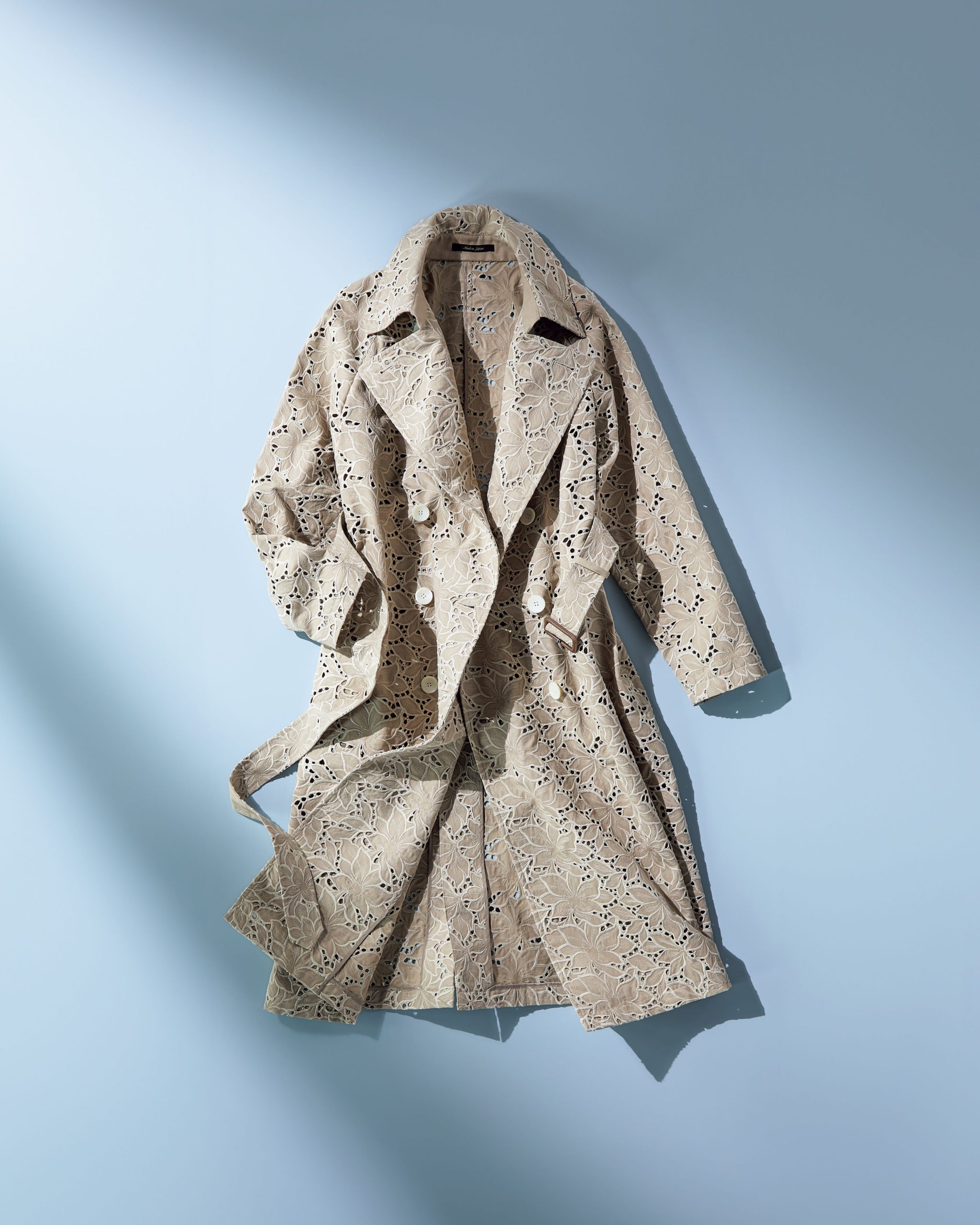 加工を手がけたのは、生地刺繡が盛んな石川県にある、日本でも有数のエンブロイダリーレース工場。複雑な柄を的確に仕上げる高度なテクニックが、特別なトレンチの誕生にひと役買って。華やかなコートの背景には、日本の職人の熟練した技と、熱い思いが込められているのです。