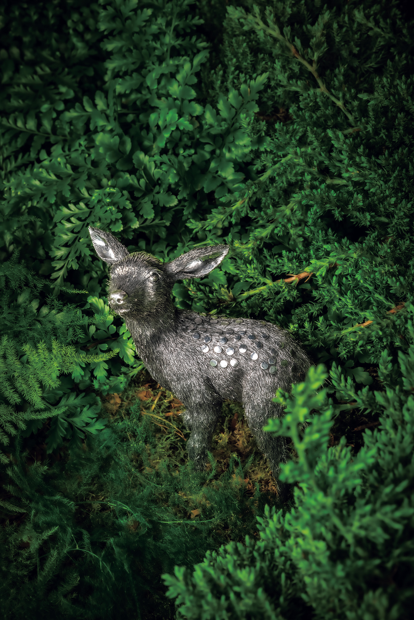 つぶらな瞳が印象的な子鹿は、背中の斑点も表現されることで、よりかわいらしい佇まいに。全体に施された細やかなヘアライン仕上げは、実際に手で触れても毛のような風合いが感じられ、シルバー製とは思えないほど。作品はすべて、デザイナーと密に打ち合わせをしながら、職人が型づくりから仕上げまで、全工程を手仕事で完遂する。だからこそ職人には多彩な技術が必要とされ、なかでも起点となる型づくりは、彫刻家のようにアーティスティックな作業だという。