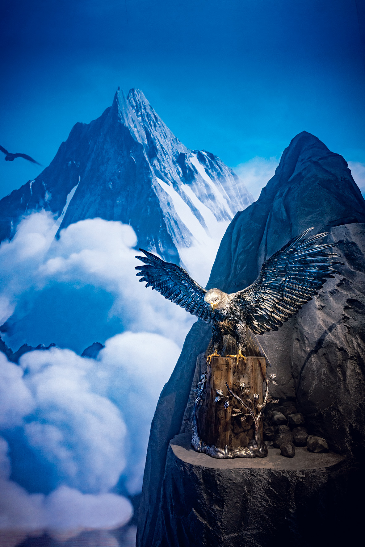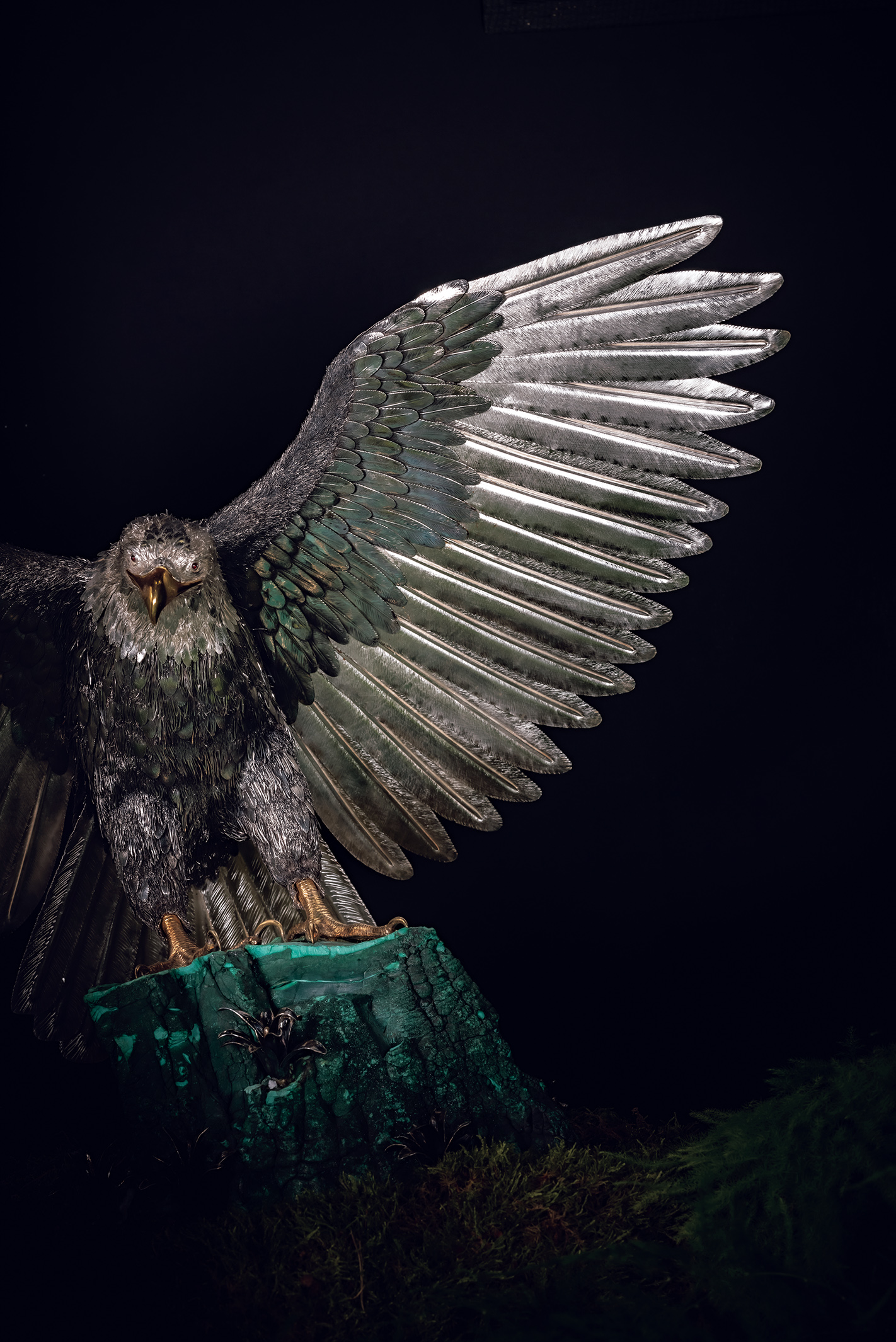 展覧会のトップを飾ったのは、大空にそびえ立つ山を模した空間に、1点だけ置かれた巨大な鷲。今回の「NATURALIA」展を記念して制作された最新作で、約87㎝の翼を広げて立つ姿が、雄大さを醸し出す。険しい地形に生息する、数少ない生物を取り上げることで、自然の真の姿に迫っている。芸術的な銀細工という存在を超えるその姿は、見る者に強く語りかけてくるよう。〝ブチェラッティ〟の自然に対する敬意と、優れた観察眼が、鮮やかに具現化されている。