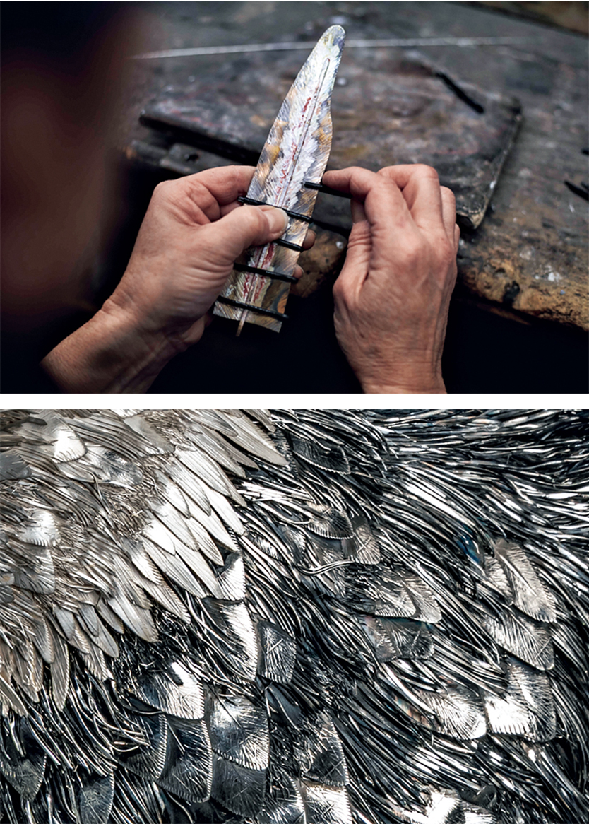 細かい毛やサイズの違う羽根が絶妙に混ざり合う。この写実的な表現は、さまざまな手法を用いて、ひとりの職人が、すべての作業を手仕事でなしたもの。銀細工に真摯に向き合ってきたメゾンならではの技術に感嘆!