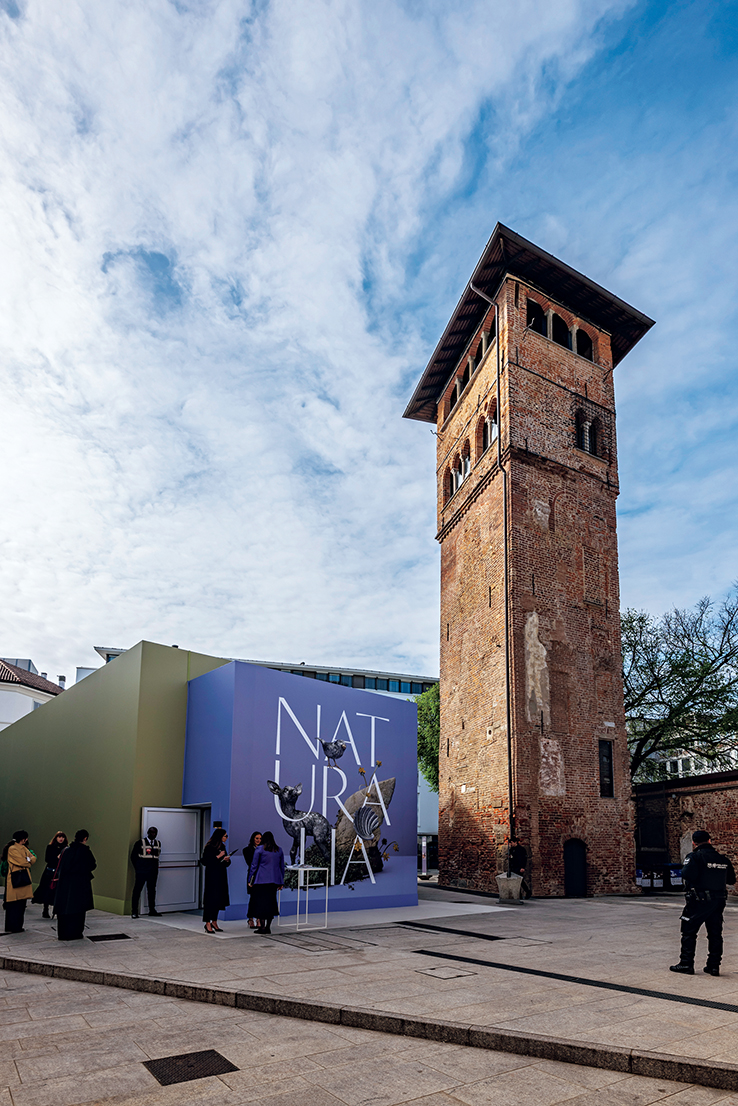 「NATURALIA」展は、ミラノの本社近くにあるトマージ・ディ・ランペドゥーザ広場で開催された。ここ一帯はローマ皇帝の宮殿跡で、中世のゴラーニ塔が今も残る、歴史が重なり合うエリア。