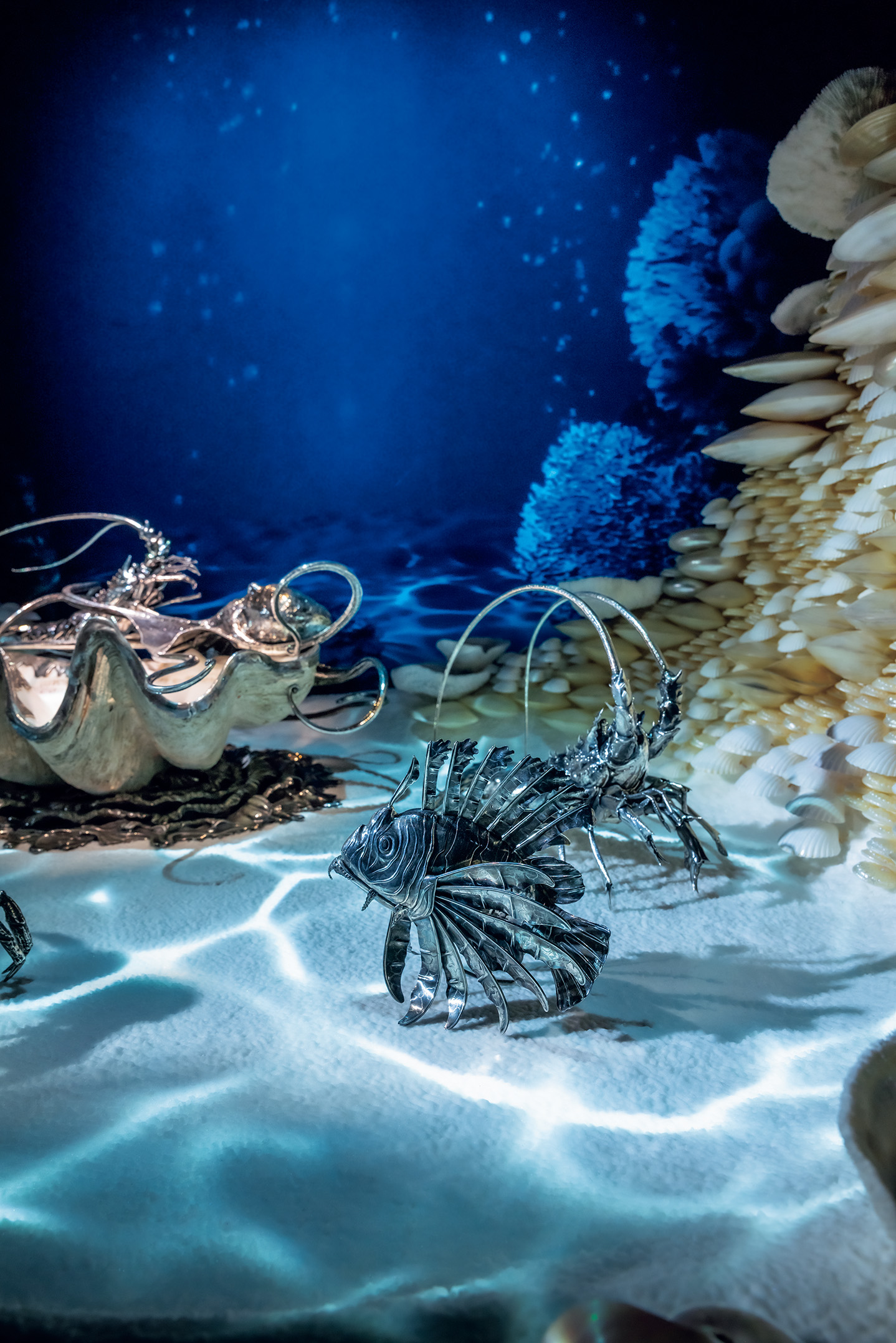 海の自然をモチーフにした「Sea」コレクション。深海を思わせる空間には、カサゴやロブスターなどがドラマティックに配され、有機的な要素とクラフツマンシップが穏やかにつながっていくよう。特徴的なフォルムの海洋生物は緻密に表現されることで、その神秘性や優美さが、より際立って。展示の背景には貝が美しく積み重ねられているが、もともとこの海のシリーズは、再生や豊かさの永遠の象徴とされている、貝殻がインスピレーションの源となっているのだとか。