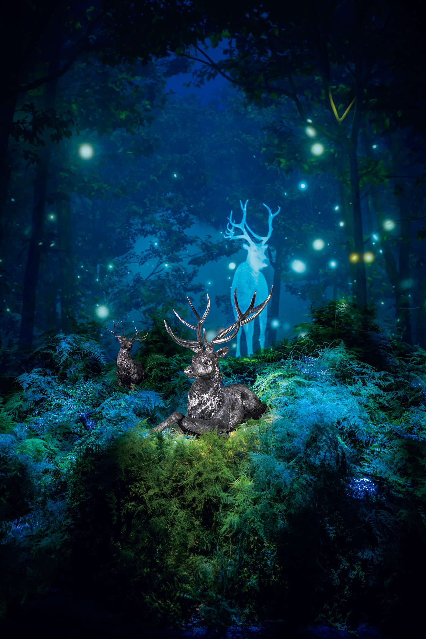 脚を折り曲げ、森の中で安らぐ鹿。決まりきった立ち姿ではなく、自然界で見受けられる動物の一瞬の動きを、そのまま切り取るところに、メゾンに根づく創造性と美意識が感じられる。本展覧会では、幻想的な映像や音に、本物の植物などを組み合わせた有機的な世界の中で作品を展示。没入型のプレゼンテーションをすることで、メゾンの伝統技術を、新しい視点から表現することにこだわった。