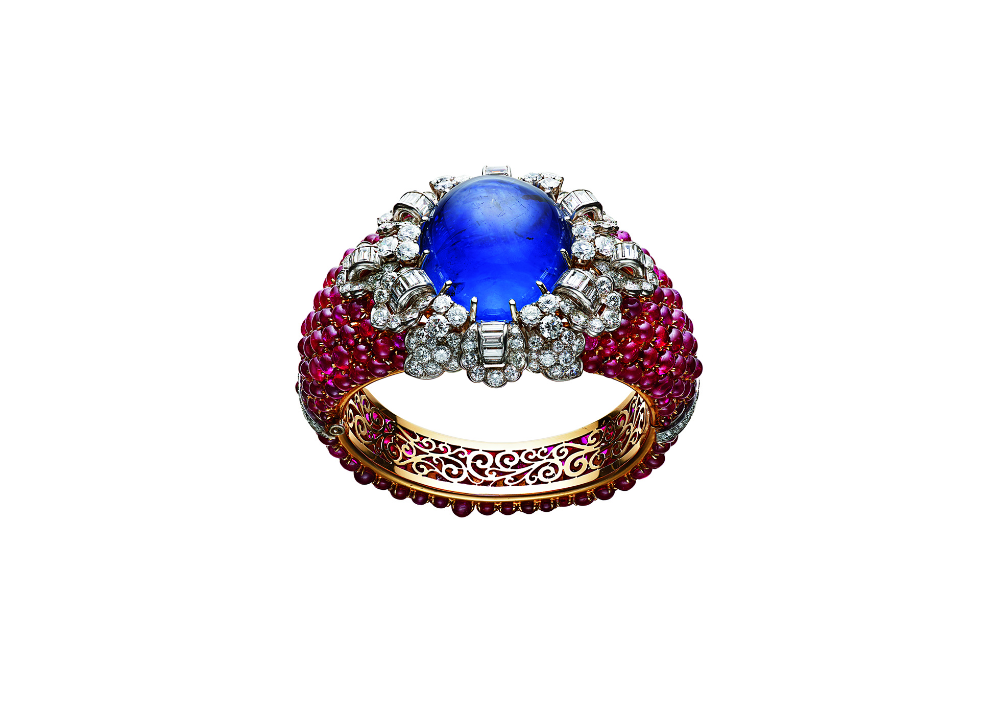 カボションカットのサファイアを中心に、ルビーとダイヤモンドを配したバングルは、〝ブルガリ〟の象徴でもある赤と青のコントラストに注目したい。丸みを帯びたカボションカットも、メゾンの作品の特徴のひとつ。