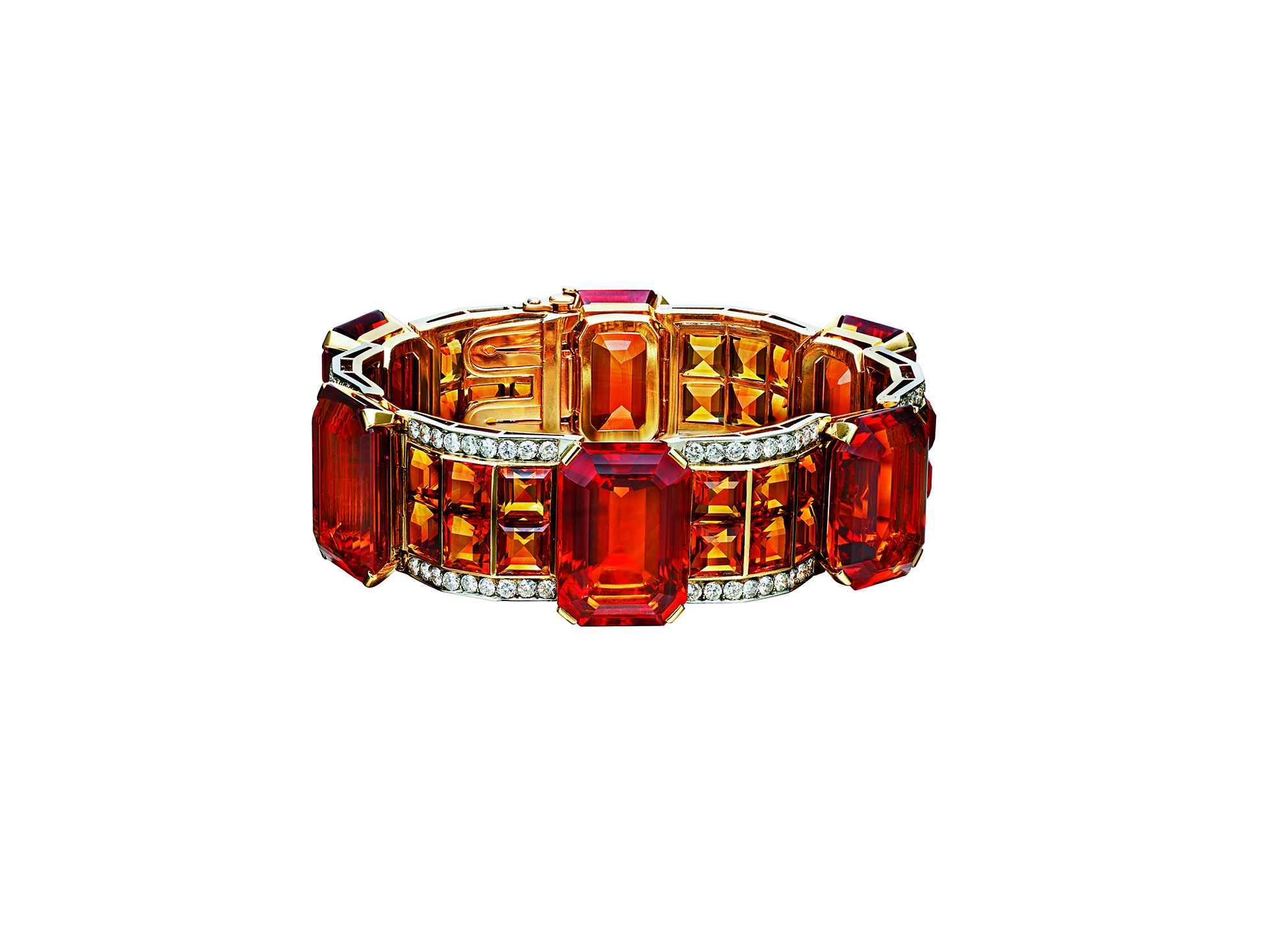 ローマの夕焼けを彷彿とさせる、温もりのある輝きをもつブレスレット。シトリンのオレンジとゴールドの色の調和に、メゾンの審美眼が反映されている。イタリア国外では初の展示であるのも、見どころのひとつ。