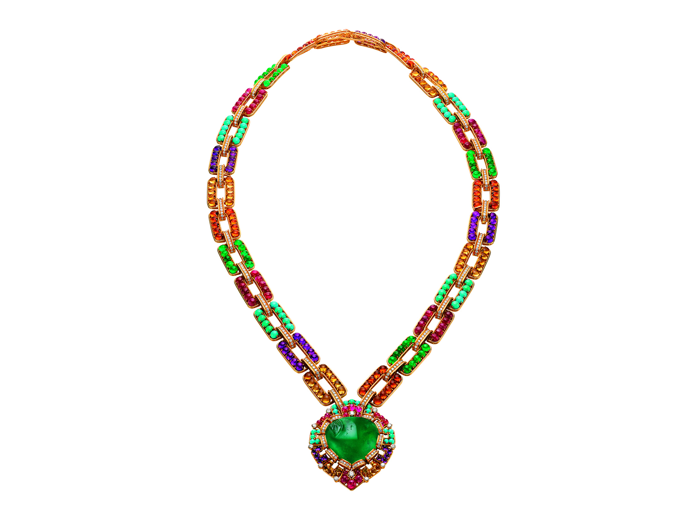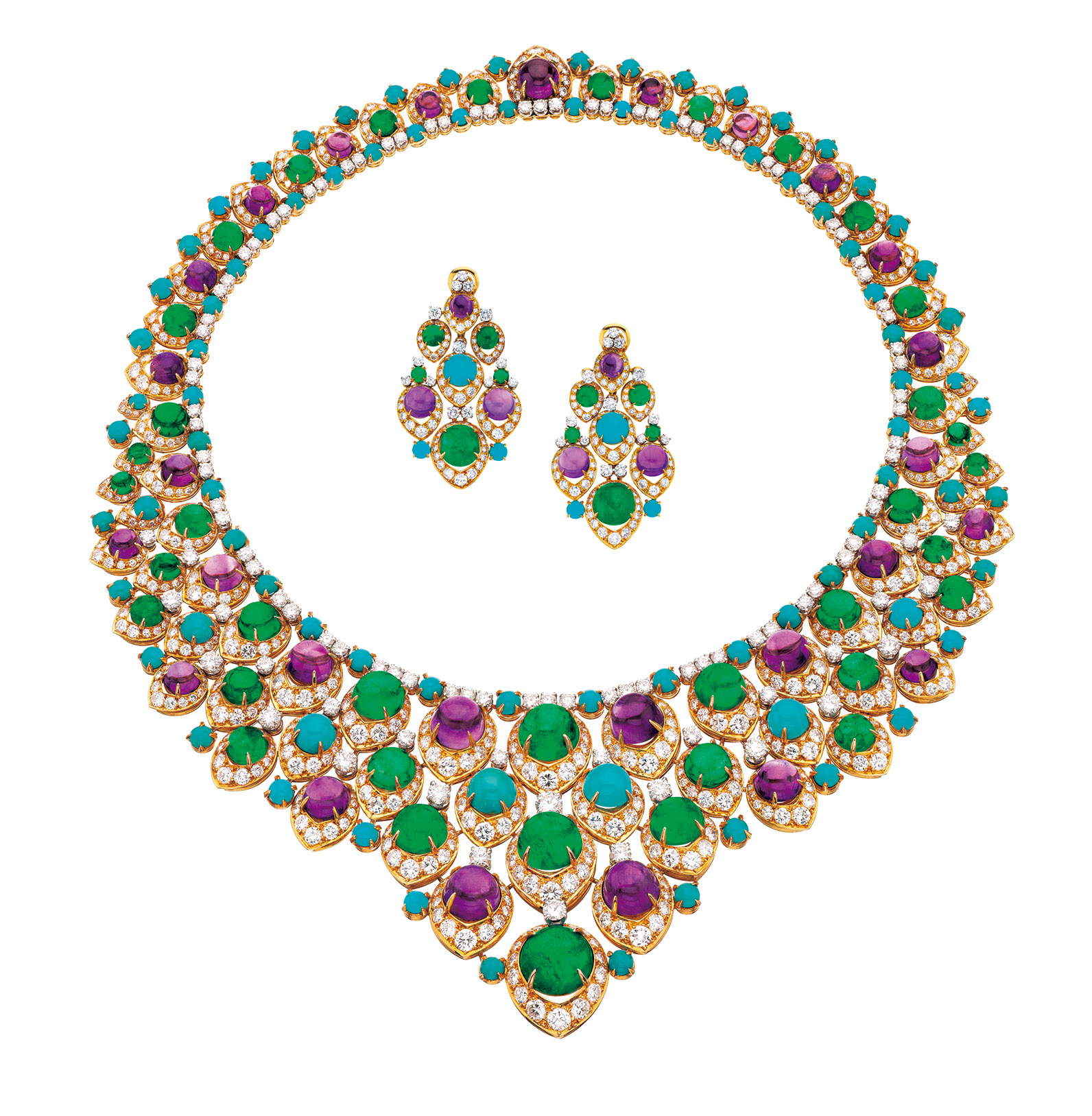 大胆な色使いが際立つ、エメラルド、アメシスト、ターコイズ、ダイヤモンドを組み合わせたネックレスとイヤリング。慣習にとらわれず、自由な発想で生み出されたハイジュエリーならではの、晴れやかさが印象的。
