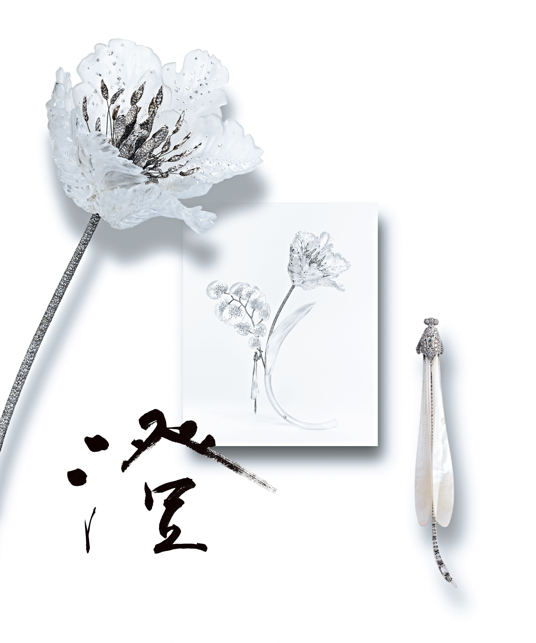 生命の誕生から終焉までの物語を詩情豊かに、6つのコンポジションで表現したコレクション「IMPERMANENCE(インパーマネンス)」。その最初の作品である「コンポジションNo.6」は、チューリップとユーカリ、トンボが織りなす、最も透明感と光にあふれた世界。植物はダイヤモンドの輝きを纏い、花や葉には特別なガラスが用いられました。職人たちはガラス加工技術を習得し、素材をわずか2ミリという極限の薄さに…。トンボの翅も、自然な虹彩が再現されています。●「コンポジションNo.6」[ユーカリ(ブローチまたはヘアジュエリー)、チューリップ(ブローチ)、トンボ(イヤリング):ダイヤモンド×ホウケイ酸ガラス×サファイアガラス×MOP×WG×ニチノール 花器:ホウケイ酸ガラス]予定価格¥170,280,000(ブシュロン)