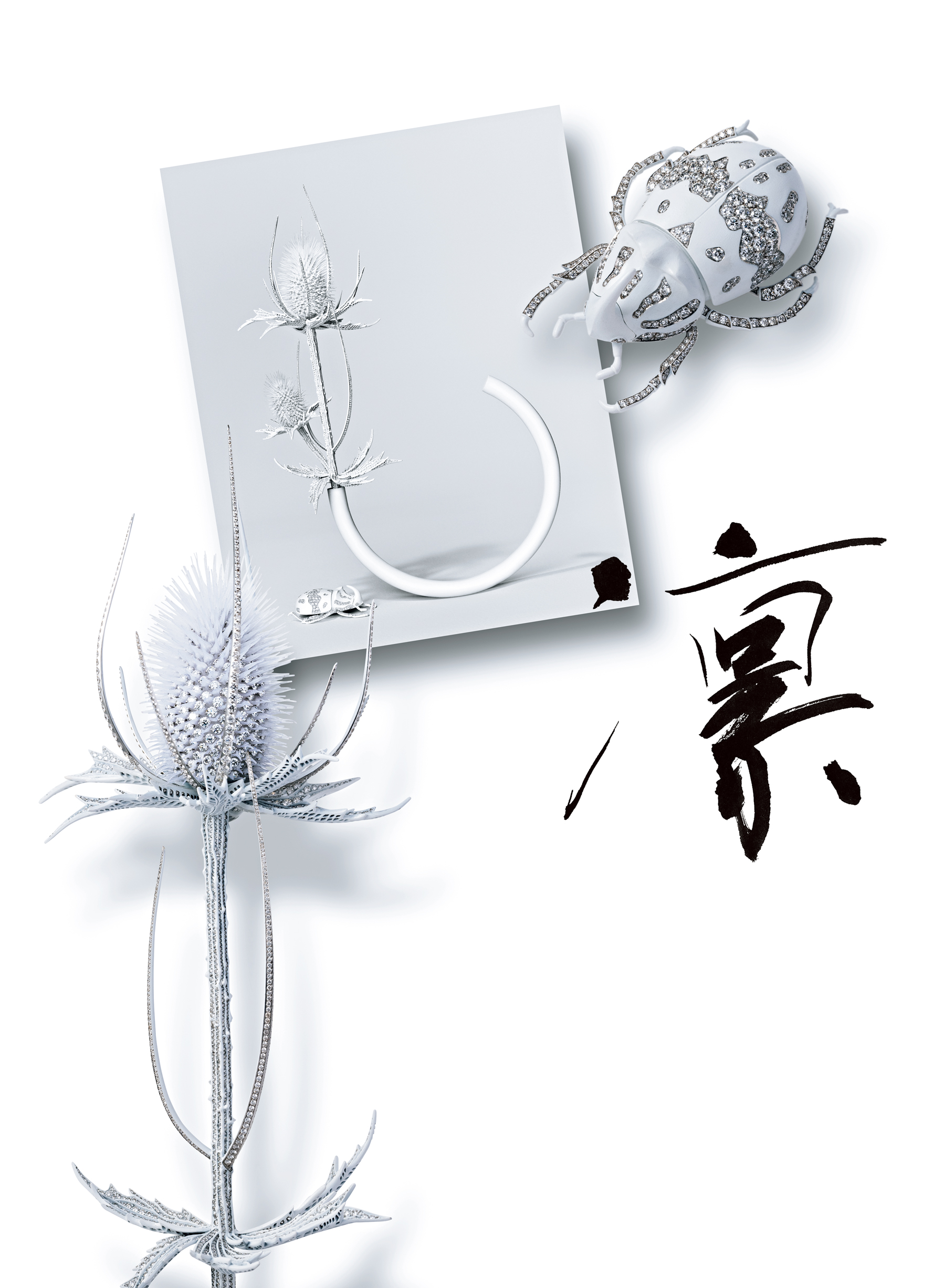 野生のアザミは、1878年のパリ万国博覧会でグランプリに輝いたブローチに始まり、メゾンの伝統に深く根ざしてきた植物のひとつです。「コンポジションNo.5」は、その凜とした姿をやわらかなホワイトのトーンで表現。アザミの野性的な美しさを再現するため、トゲのある花冠はバイオ由来樹脂を用いて、高解像度3Dプリント技術によってつくられました。この素材はこれまでハイジュエリー制作に用いられた例がなく、職人たちは新たな課題に挑むことに。アザミ本体にはメタルの台座がないため、これまでの方法ではダイヤモンドをセッティングすることができません。そこで職人たちは「クチュールセッティング」という画期的な技法を開発。アザミの表面の微細な凹みに、ゴールドの台座にセットされた800石以上のダイヤモンドが手作業で縫い込まれました。アザミの茎、葉と同じようにホワイトゴールドで形づくられたカブトムシには、ホワイトセラミックコーティングが施され、ダイヤモンドが煌めきを放ちます。●「コンポジションNo.5」[アザミ〈大〉(ブローチまたはクロスボディジュエリー)、〈小〉(ダブルフィンガーリング)、カブトムシ(ブローチ):ダイヤモンド×透明バイオ由来樹脂×バイオ由来樹脂×WG×ホワイトセラミックコーティング 花器:ホワイトコンポジット]予定価格¥188,760,000(ブシュロン)