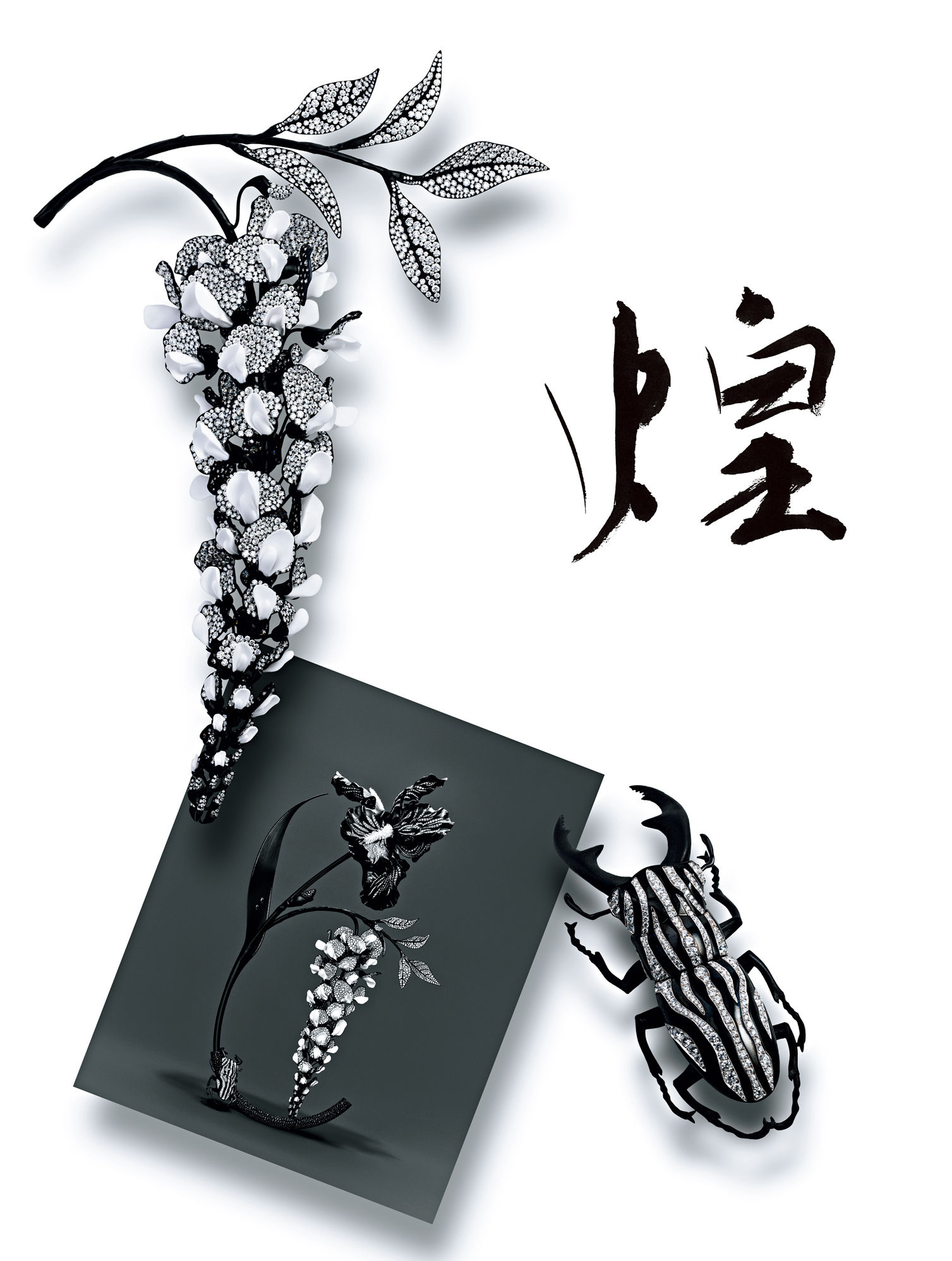 自然が静かに闇へと移ろい、徐々に終焉が忍び寄る「コンポジションNo.3」。ダイヤモンドの輝きによって強調される、黒と白のコントラストが、深まる闇のなかに浮かび上がります。マットブラックの花びらにダイヤモンドが光のラインを描くアイリスの花。藤は軽量化と耐久性という相反する条件を両立させて、完成に至りました。セラミック、チタン、アルミニウムといった軽量な素材を組み合わせることで、ボリュームを損なうことなく、わずか150グラムに仕上げることができたのです。葉や花びらにセットされたダイヤモンドが、繊細な光のニュアンスを作品にもたらします。そして、花々に引き寄せられるように、作品の下部にはクワガタムシの姿が…。そのチタン製の体にはダイヤモンドの縞模様が施され、繊細な煌めきを放ちます。●「コンポジションNo.3」[アイリス(ショルダーブローチ)、藤(ヘアジュエリーまたはブローチ)、クワガタムシ(ブローチ):ダイヤモンド×ブラックスピネル×ホワイトセラミック×ロッククリスタル×ホワイト樹脂×WG×チタン×AL 花器:ブラックスピネル×AL×ブラックDLCコーティング]予定価格¥359,040,000(ブシュロン)