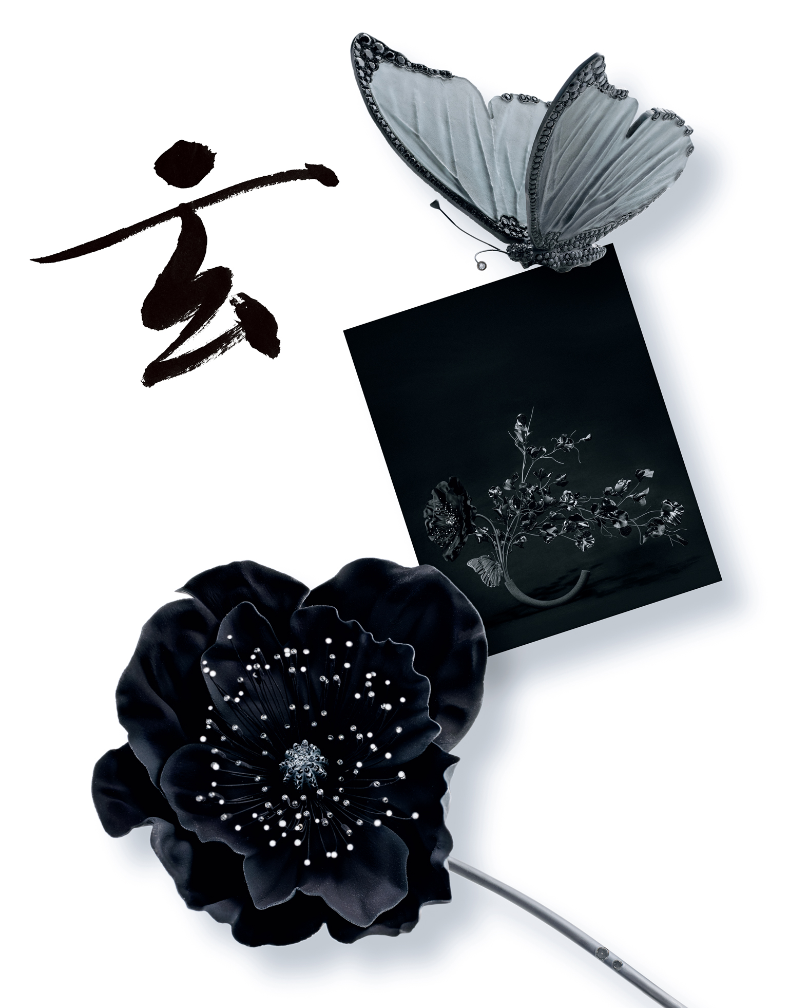 コレクションを締め括る「コンポジションNo.1」では、自然のサイクルの終焉を映し出します。光は消え、すべては闇のなかへ。ポピーの花びらはマットブラックチタン製。表面には可視光の99.9%以上を吸収するベンタブラックRという特殊な物質がコーティングされ、限りなく完全な黒に。花芯には、キューレット(先端部分)を上にしたブラックスピネルをセット。スイートピーの花びらは、黒のアベンチュリンガラスとオニキスでつくられ、繊細な表情に。そして、幽玄の気配を纏って舞う蝶の翅には、漆黒でありながら透明感を併せもつ特別なガラスが用いられています。●「コンポジションNo.1」[ポピー(ヘッドジュエリーまたはブローチ)、スイートピー(ブローチ)、蝶(ショルダーブローチ):ダイヤモンド×アベンチュリンガラス×ガラス×オニキス×ブラックスピネル×WG×チタン×マグネット×ベンタブラック®×ブラックセラミックコーティング 花器:ブラックサンド]予定価格¥133,320,000(ブシュロン)