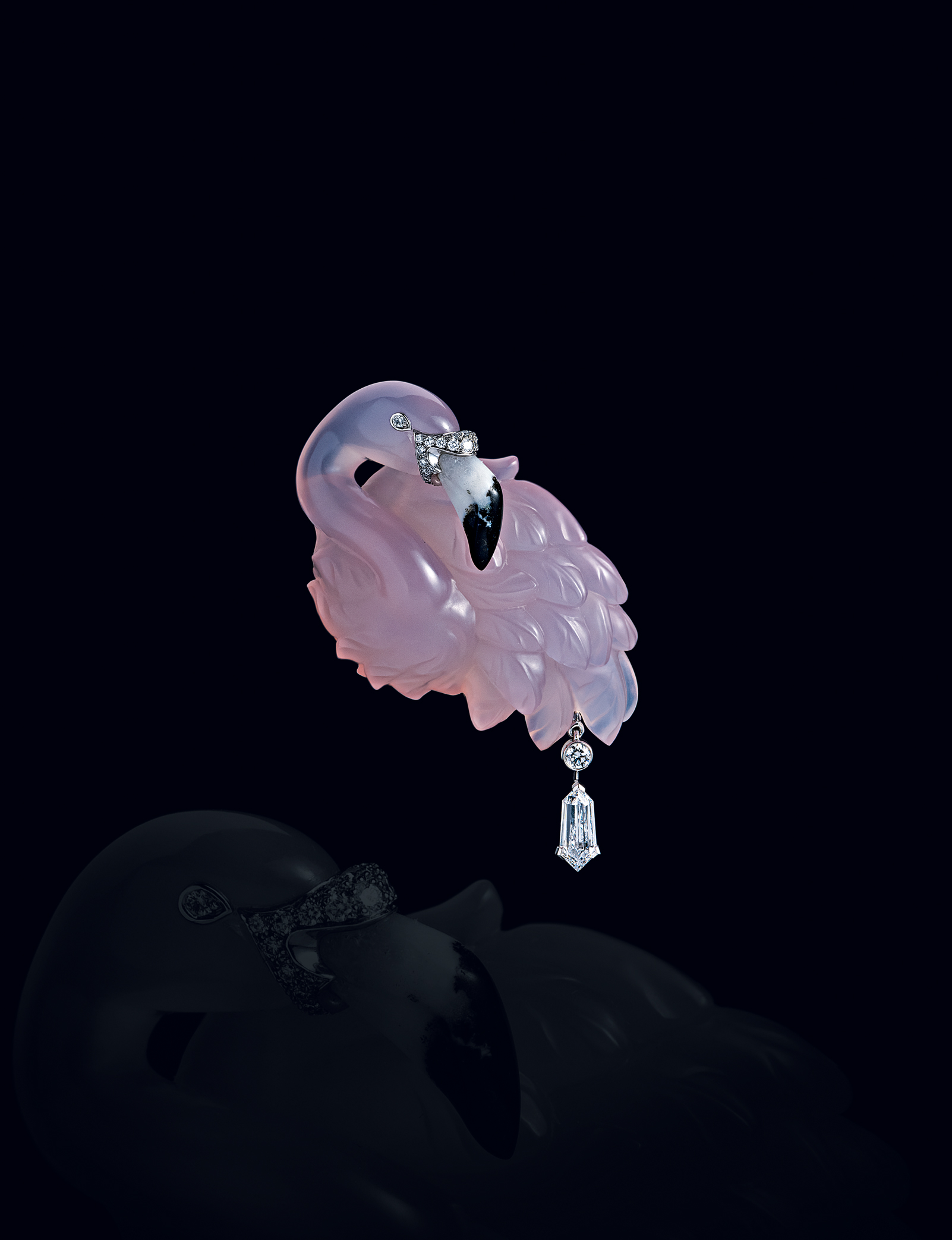 フランスが誇る伝統工芸技術「グリプティック(宝石彫刻)」で表現された優美なフラミンゴ。「カルティエ」はハイジュエリーメゾンで唯一、その専門アトリエを擁している。フラミンゴはウィンザー公爵夫人のブローチにも登場した、メゾンにとって伝統のモチーフ。その体はピンククオーツで、くちばしはメノウ。吊り下がるカイト形のダイヤモンドは、綿羽を表している。ブローチ[ピンククオーツ100.50ct×メノウ6.00ct×ダイヤモンド計約1.00ct×WG]参考価格¥48,312,000(カルティエ)
