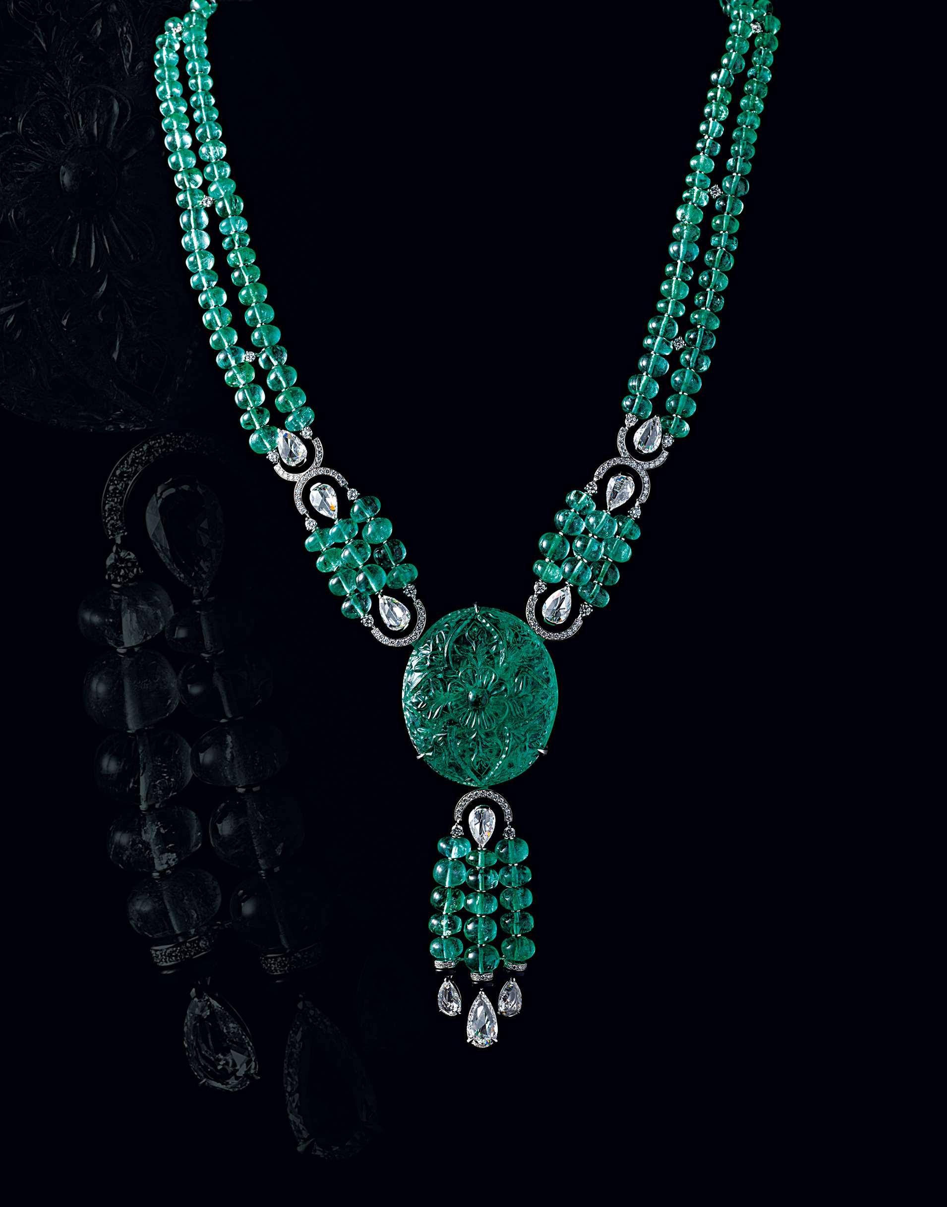 透明度が高いコロンビア産エメラルドに、フラワーモチーフの彫刻を施したネックレス。花の向こうには、エメラルド独特の神秘的な景色が広がる。ビーズカットのエメラルドも澄んだグリーンが美しく、ダイヤモンドがその光彩を引き立てる。ネックレス[エメラルド計269.39ct(センター78.92ct)×ダイヤモンド計約10.18ct×オニキス計2.74ct×PT]参考商品(カルティエ)