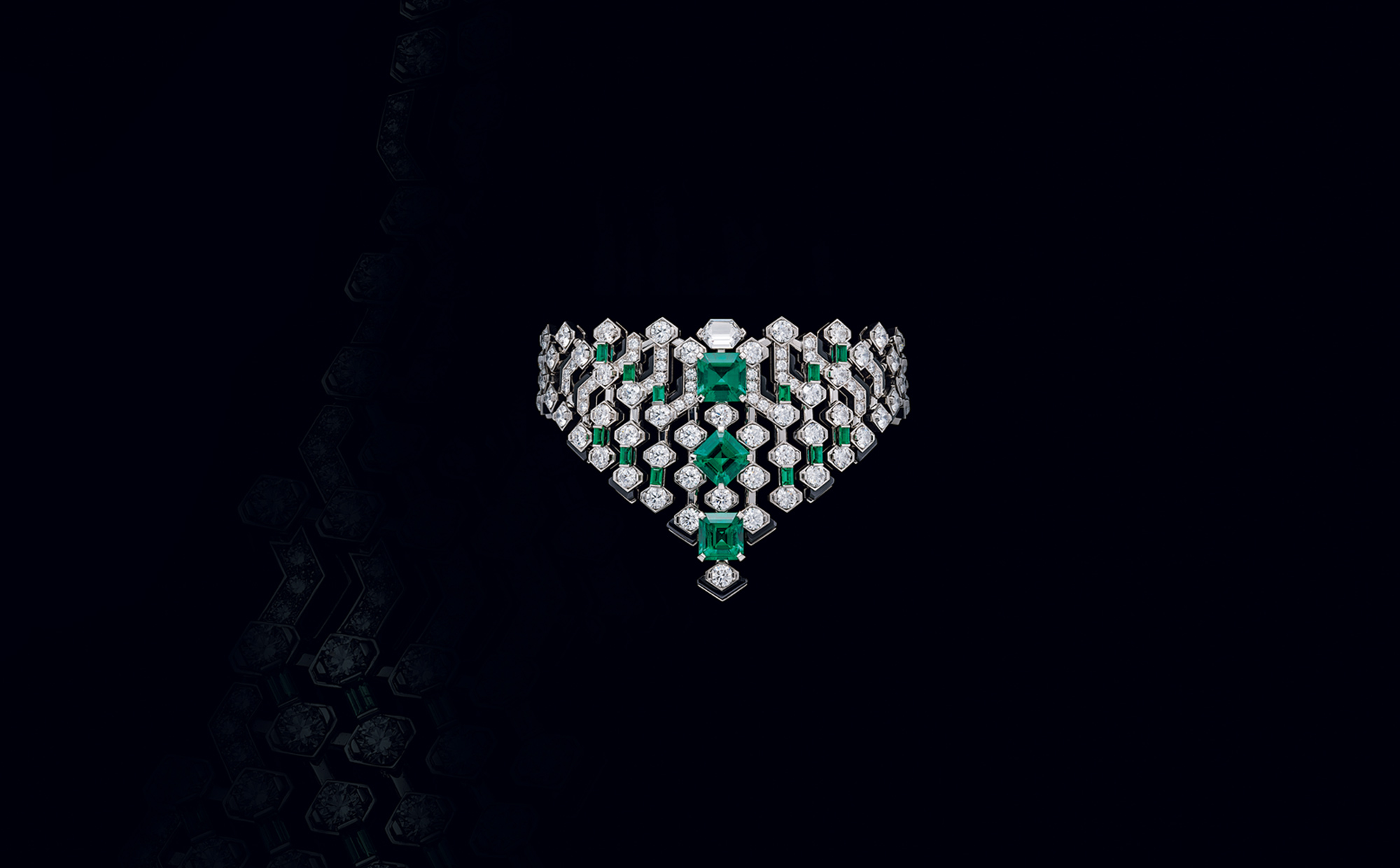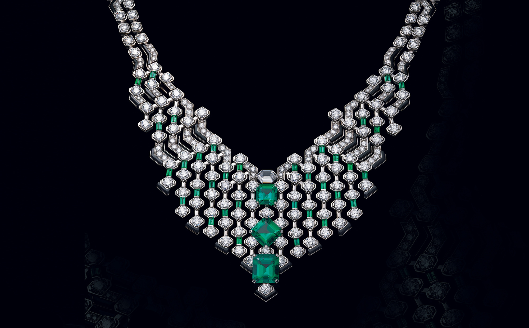 幾何学的なオープンワークが、モダンで軽やかな印象。中央では、サイズの異なるエメラルドが、向きを変えて並ぶ。セットされた3石は、いずれも鮮明で、透明度の高いコロンビア産。この3石があえて調和を壊し、作品にフォーカルポイントを生み出した。ネックレス[ダイヤモンド計約32.19ct×エメラルド計約8.74ct(センター3石計6.73ct)×オニキス計6.36ct×WG]参考価格¥502,920,000(カルティエ)