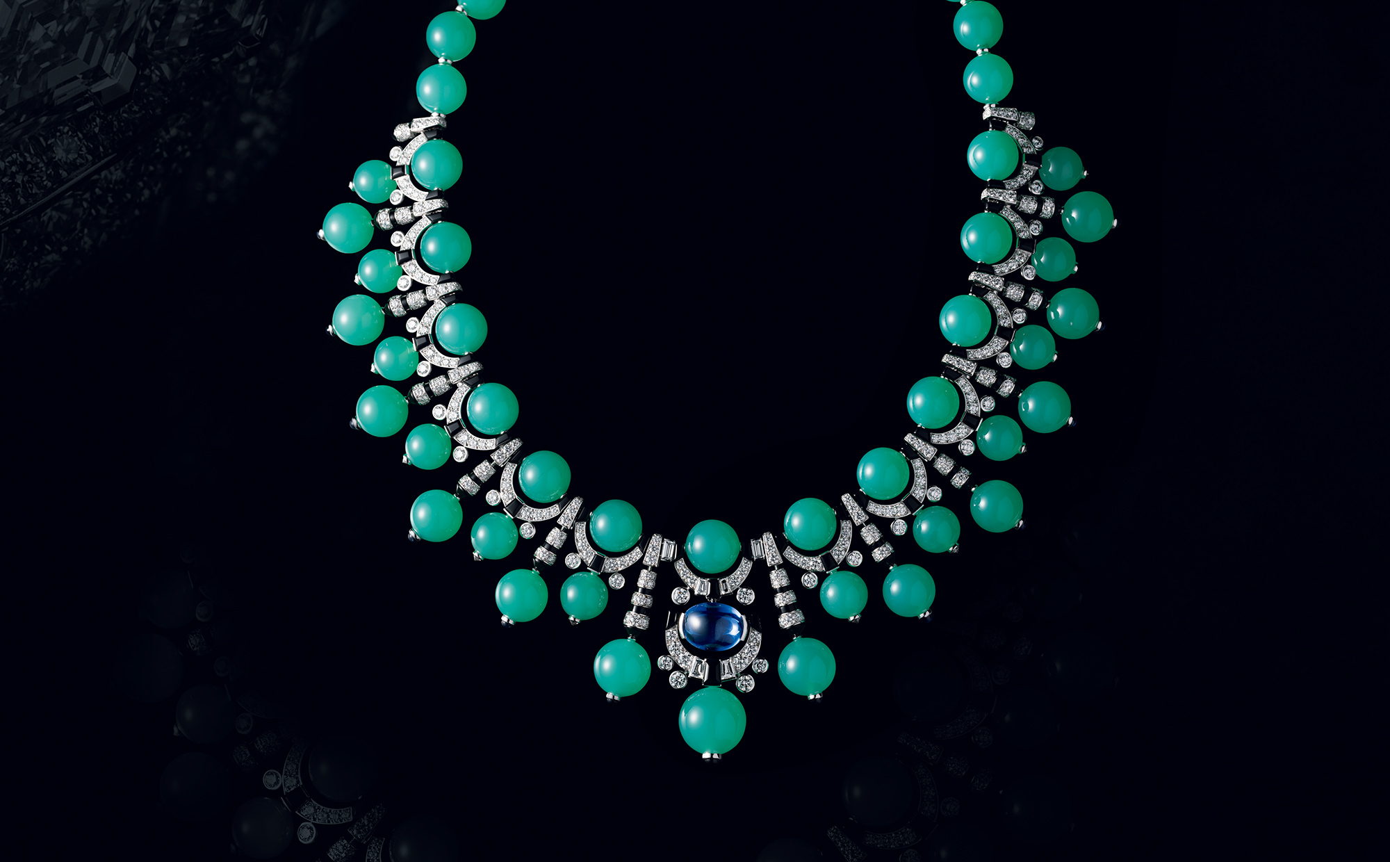 幾何学的に連なる曲線、エキゾティックなピーコックカラー、大胆なボリューム…。すべてに「カルティエ」のデザインコードがちりばめられたネックレス。理想的なカラーのクリソプレーズは大きなビーズにカットされ、そのフォルムもデザインの一部に。ネックレス中央にセットされたサファイアが、デザインの対称性を強調し、モダンな美しさを際立たせる。ネックレス[サファイア計約11.34ct(センター9.06ct)×クリソプレーズ計447.82ct×ダイヤモンド計約13.61ct×オニキス計15.20ct×PT]参考価格¥172,920,000(カルティエ)