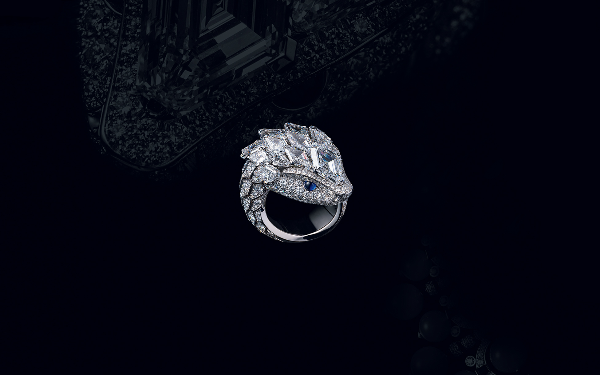 動物の意匠化において重要なのが、リアリズムと様式化のバランス。「カルティエ」はその見極めに非常に秀でたメゾンでもある。これは寓話に登場するヘビが着想源のリング。頭部の鱗は、六角形のステップカット・ダイヤモンドを用いて、グラフィカルに表現されている。リング[ダイヤモンド計約14.86ct×サファイア計約0.38ct×WG]参考価格¥139,920,000(カルティエ)