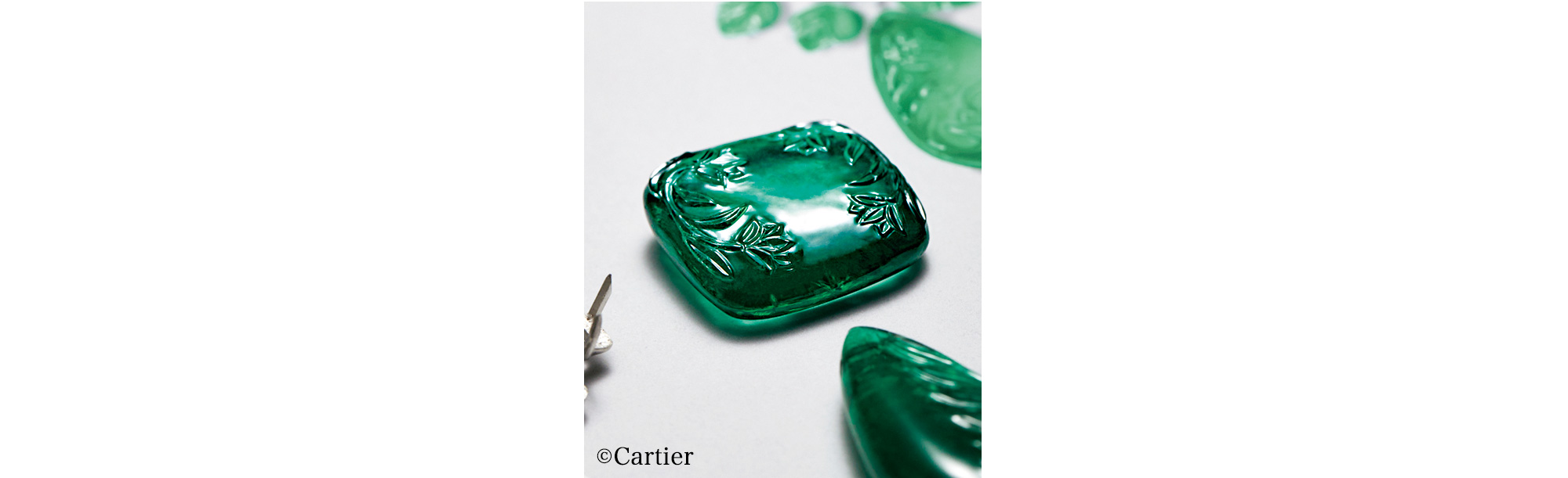 「カルティエ」のハイジュエリーにも多く見られる宝石彫刻。このエメラルドもそのひとつ。彫刻されるモチーフの題材は、草木などの植物が多い。