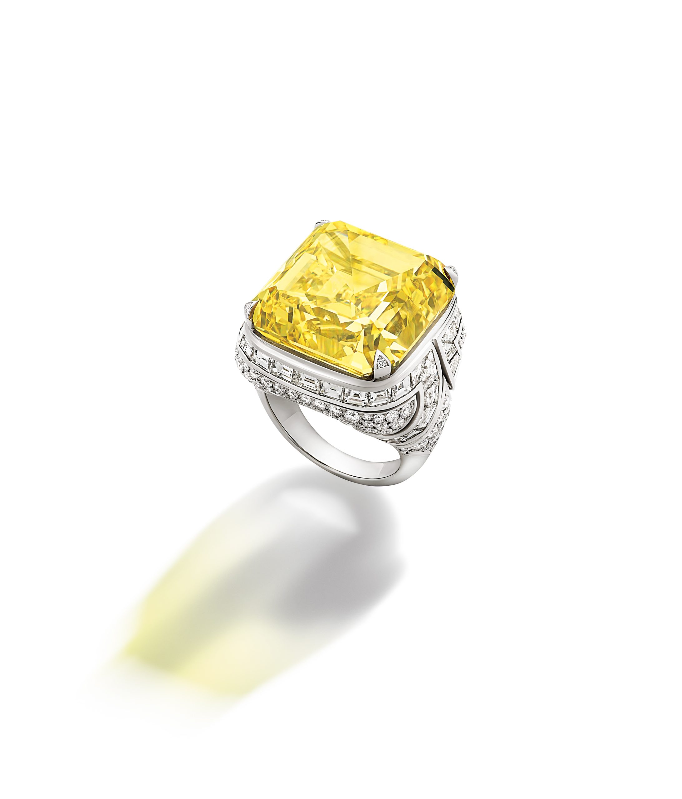今回のコレクションを代表する5点のマスターピース「ギャラリー オブ ワンダーズ」のリング。たぐい希な宝石の美しさと魅力が存分に表現された、まさに至宝! この作品は、1928年にレオニルデ・ブルガリが母親のために初めてデザインした「トロンビーノ」リングを現代的に再解釈したもの。リングにセットされたのは、45カラットを超える極めて希少なファンシービビッドイエローダイヤモンド。リング[イエローダイヤモンド45.07ct×ダイヤモンド計6.94ct×PT]参考商品(ブルガリ・ジャパン)