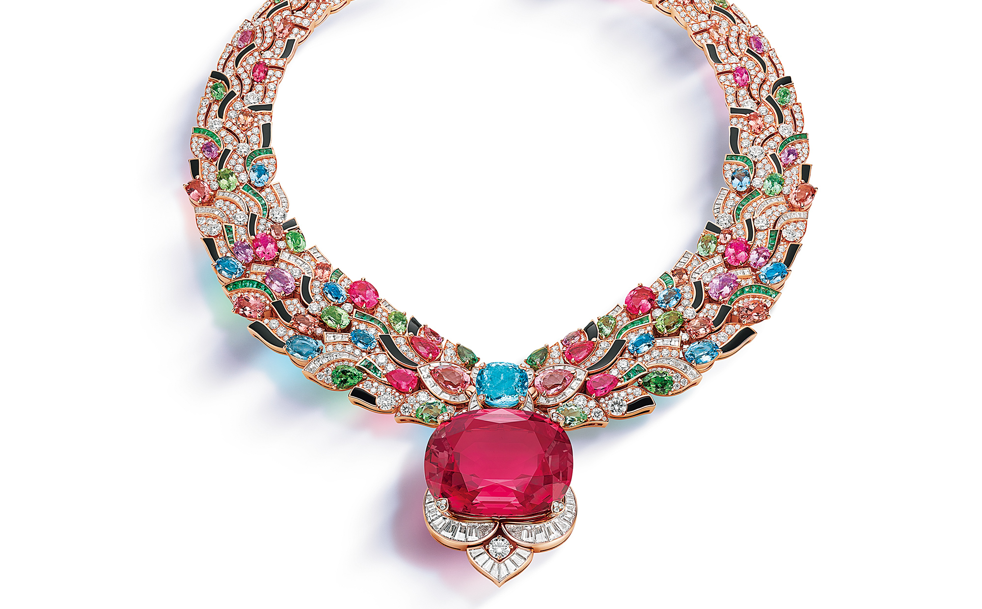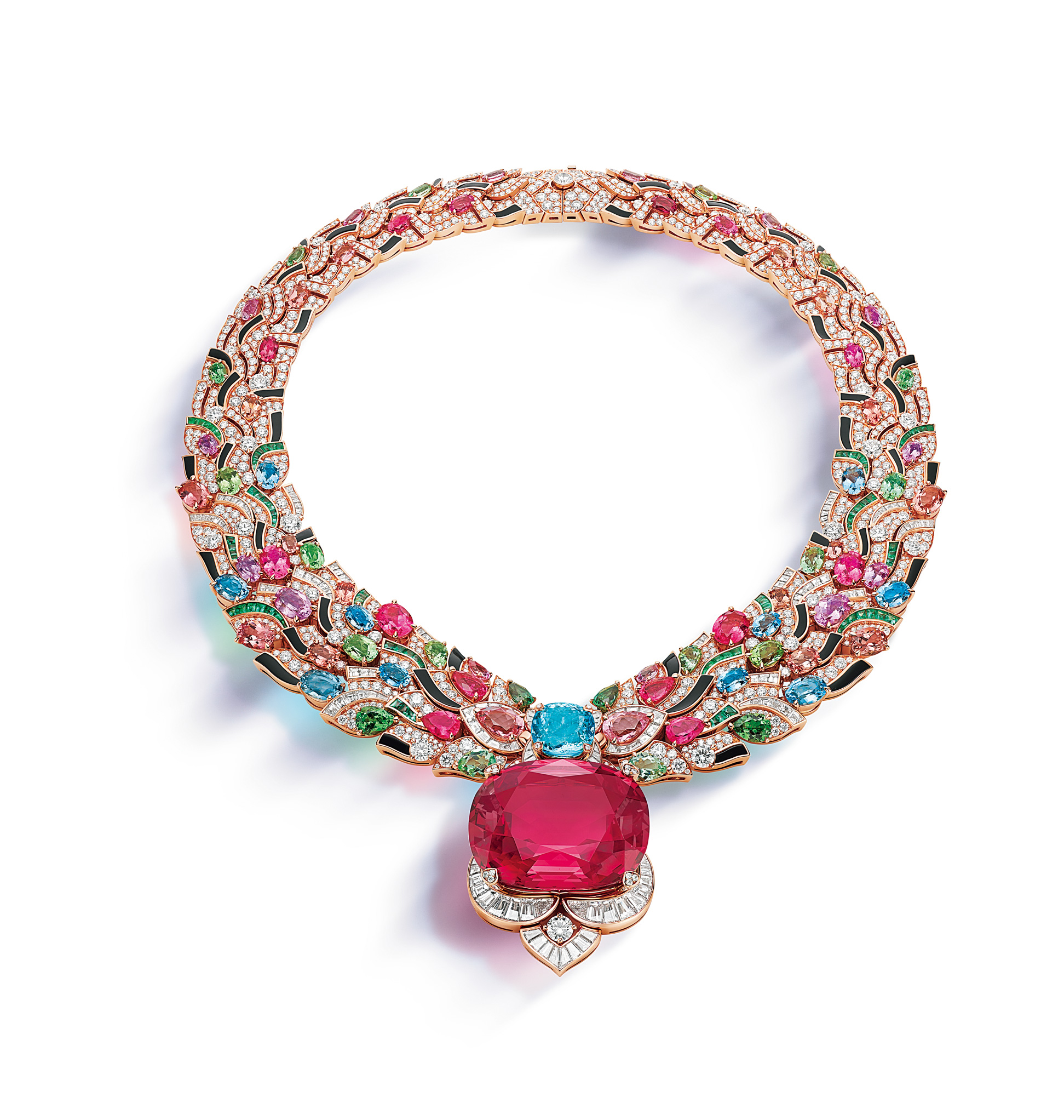 世界最古の都市ジェリコにある、18世紀のモザイク画にインスピレーションを得てデザインされた、色鮮やかなマスターピースのネックレス。その中央で光彩を放つバラ色のジェムストーンは、世界第1位のクオリティを誇る約131カラットのタジキスタン産スピネル。その上部にセットされたパライバトルマリンとの鮮烈なコンビネーションによって、華やかな色彩が一層際立つ。ネックレス[スピネル131.21ct×パライバトルマリン8.36ct×ダイヤモンド計18.15ct×アクアマリン計8.96ct×ルベライト計12.78ct×トルマリン計32.62ct×トパーズ計7.14ct×エメラルド計2.49ct×オニキス×PG]参考商品(ブルガリ・ジャパン)