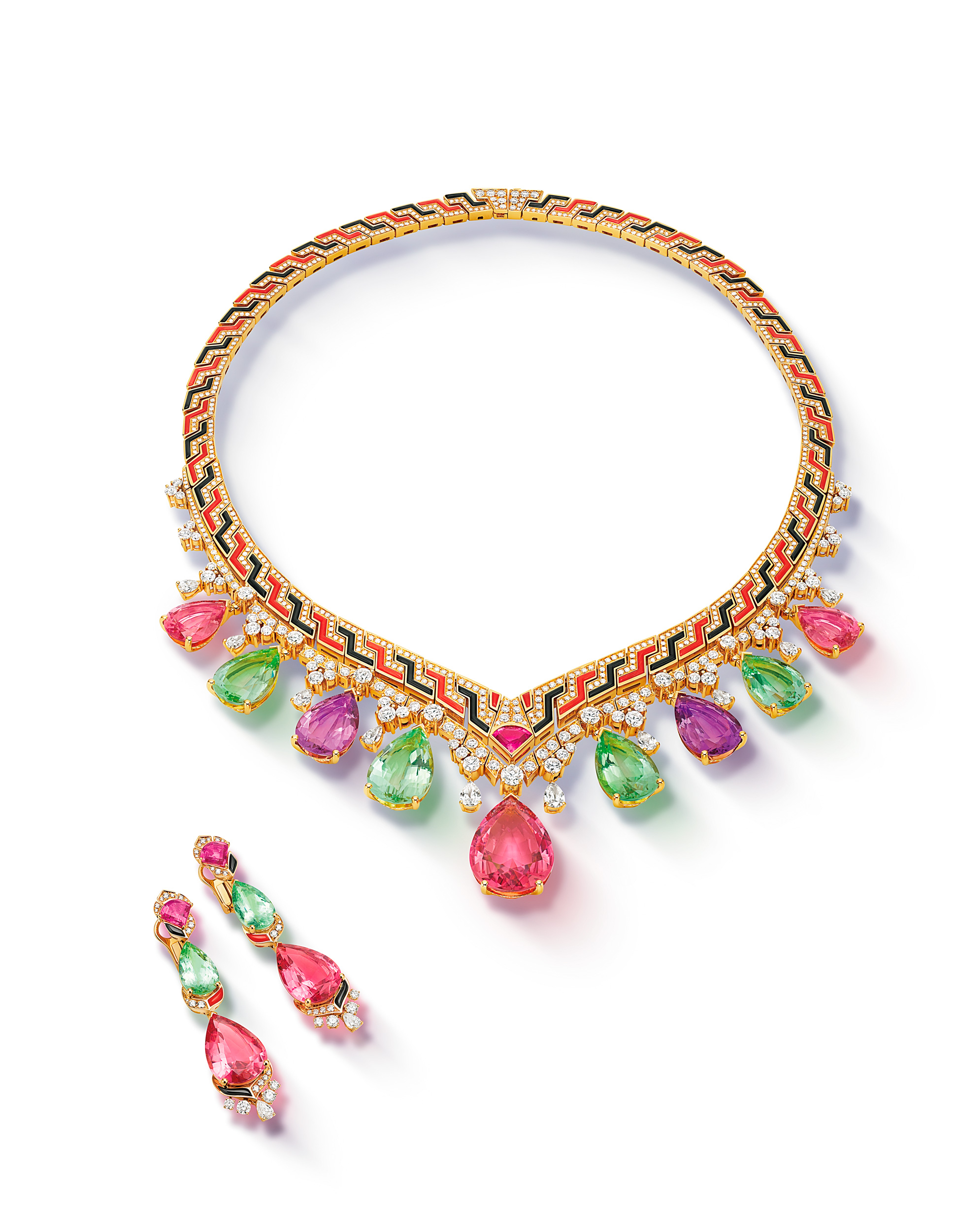 古代ギリシャの壺が、デザインの着想源。コーラルとオニキスで描かれたパターンが、グレカ模様を想起させる。ネックレスのフォルムにも、壺の優美な曲線が取り入れられた。鮮麗なカラーストーンが、古代の意匠にモダンな美しさをもたらす。ネックレス[ピンクトルマリン計29.08ct×グリーントルマリン計33.59ct×アメシスト計14.07ct×ルベライト0.94ct×ダイヤモンド14.21ct×コーラル×オニキス×YG]参考商品・イヤリング[ピンクトルマリン計21.97ct×グリーントルマリン計8.93ct×ルベライト計2.44ct×ダイヤモンド計1.44ct×コーラル×オニキス×YG]参考商品(ブルガリ・ジャパン)
