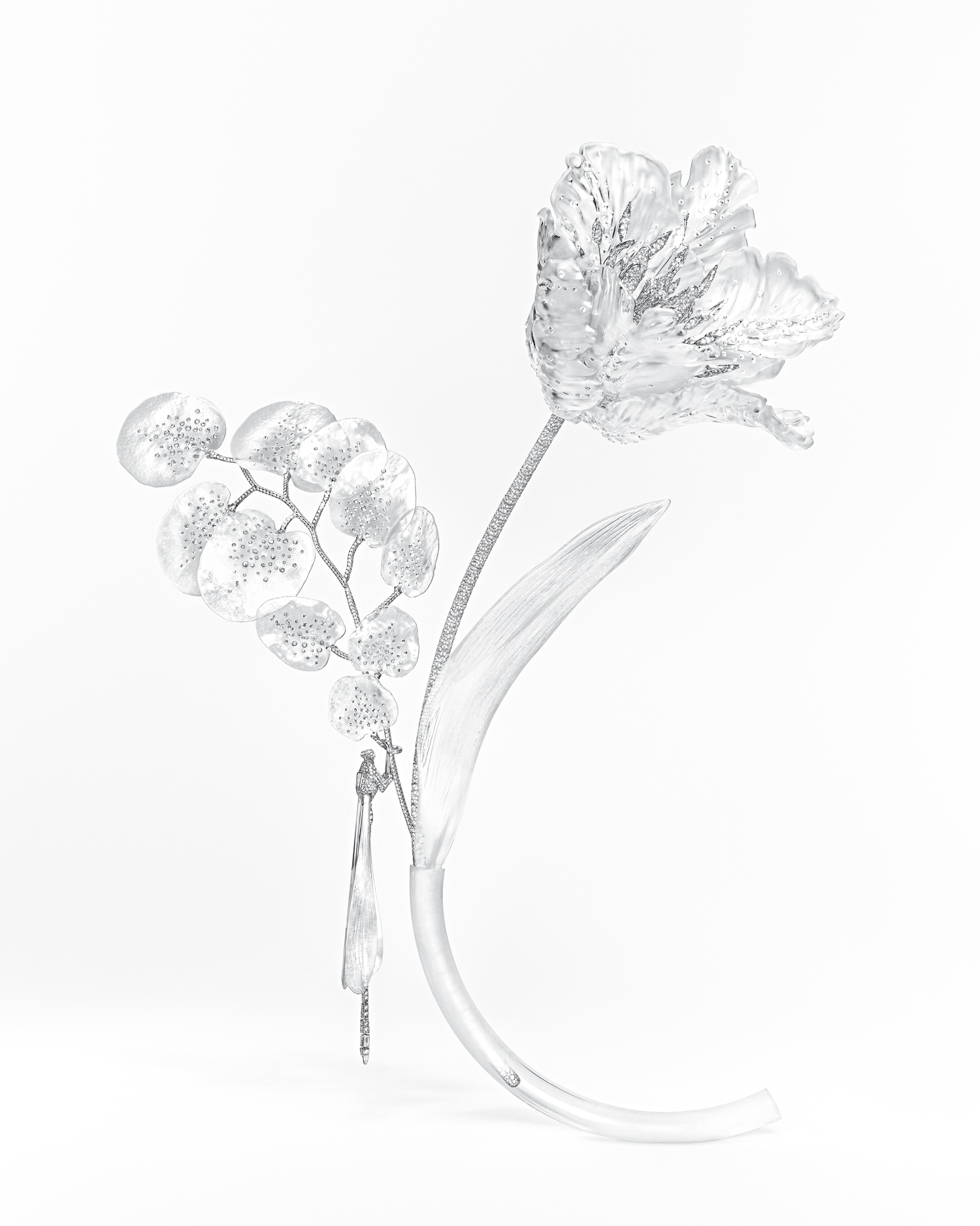 「自然の美しさが色褪せる前に、その一瞬を捉え、ハイジュエリー作品に閉じ込めたいと考えた」と語るクレール・ショワンヌは、延べ18,000時間以上におよぶ緻密な作業を経てコレクションを完成させた。