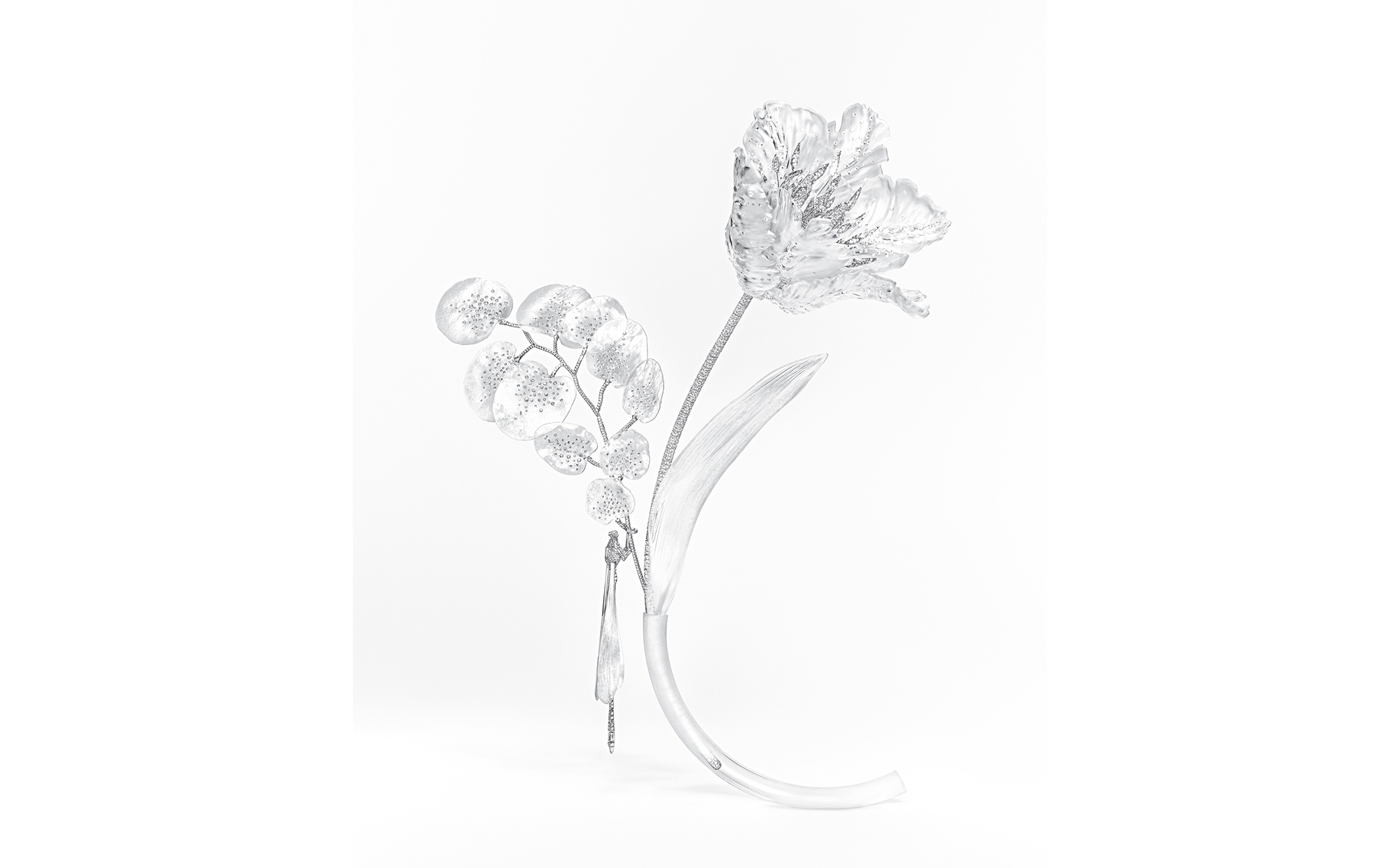 2018年発表の「Fleur Éternelle(フルール エターナル)」で掲げた〝儚いものに永遠を与える〟というビジョンは、本作にも引き継がれている。着想源となったのは、日本文化に根ざす「生け花」と「侘び寂び」の思想。その創作は、自然の一瞬に宿る美を捉え、静けさのなかに息づく生命の輝きを永遠のものにする試みでもあった。