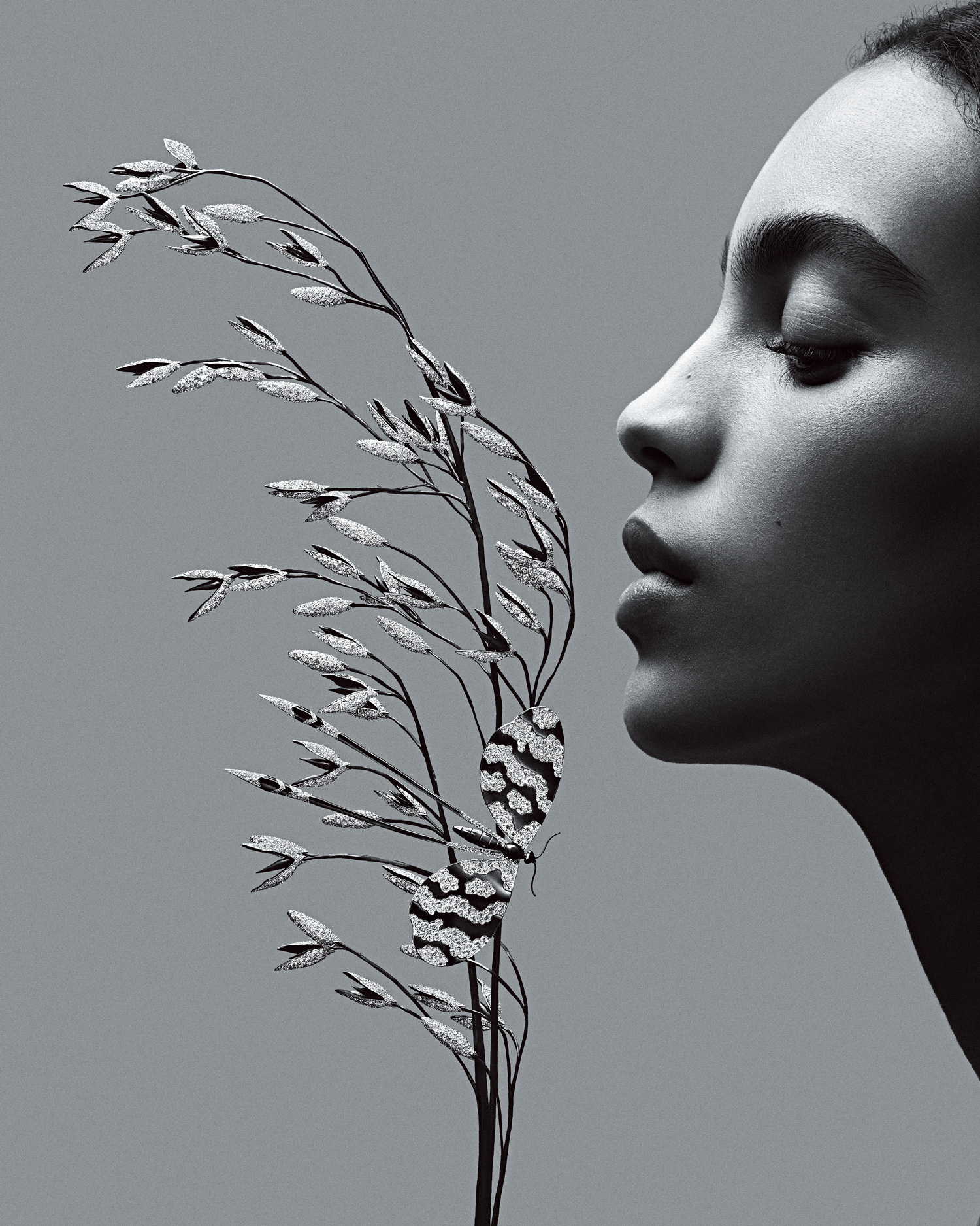 植物と昆虫から成る6つのコンポジションは、「光」を軸に構成されている。コレクションが始まるNo.6は最も明るく軽やかな光を宿し、その光は徐々に翳りを帯びて、最後のNo.1では深い暗闇のなかへ。光の変遷は誕生から終焉へ向かう自然の循環を象徴し、私たちに「儚い自然を守る」という意識を呼び起こさせる。