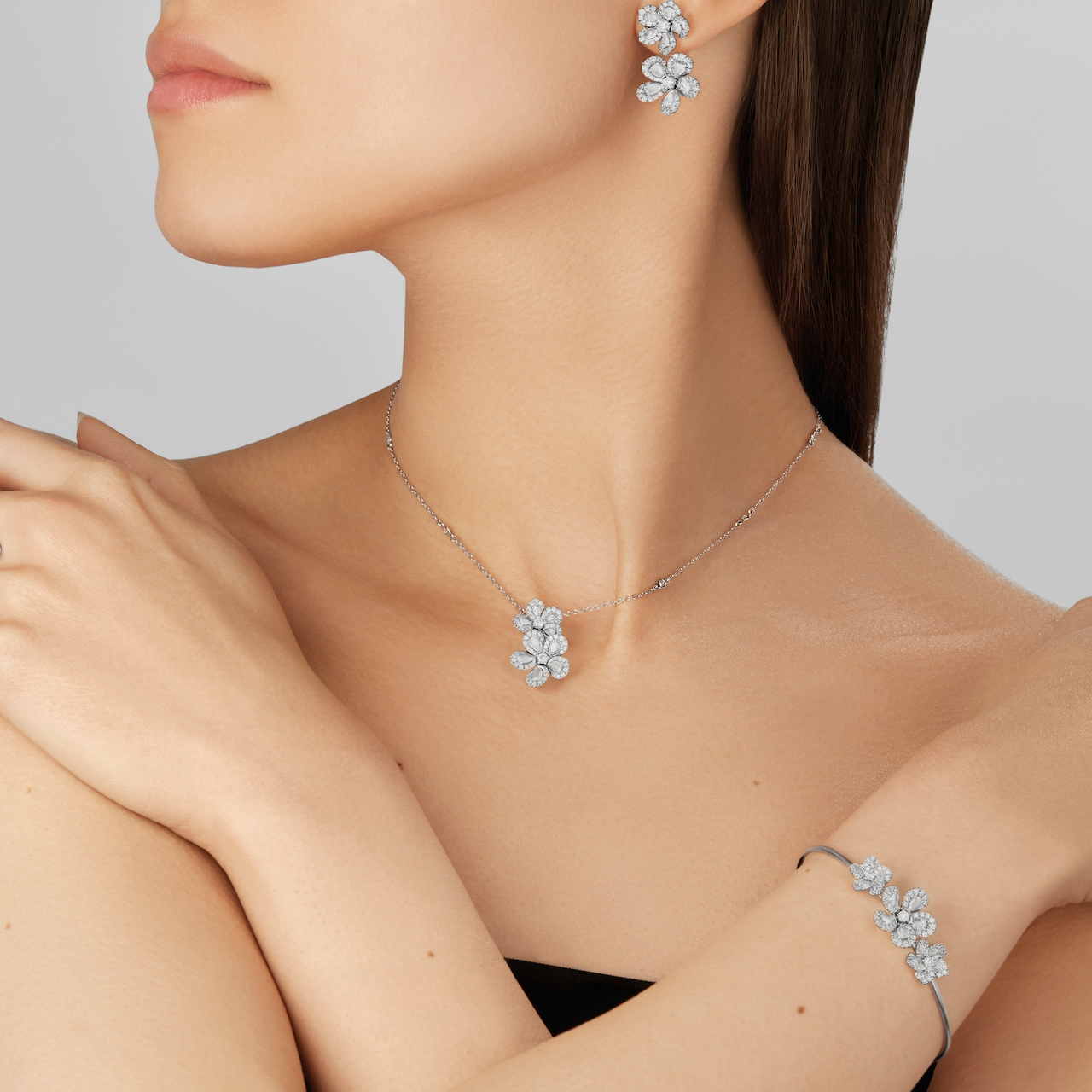 ブランドを象徴する人気コレクションのひとつ『Miss Daisy』は、イングリッシュ・サマー・ガーデンに咲く可憐なデイジーにインスピレーションを得ています。きらめくペアシェイプの花弁にローズカットダイヤモンドが配され、センターストーンとして輝く華やかなブリリアントカットのダイヤモンドがアイコニックな、代表的なコレクションです。