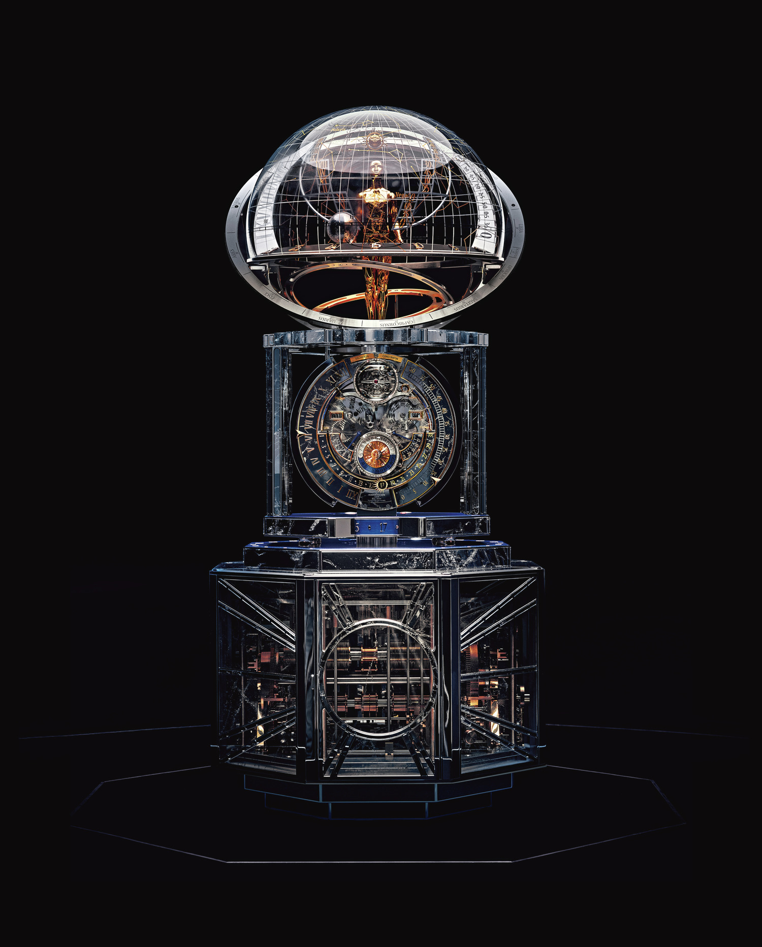 一連の端緒となった「天地創造」から着想を得た「ラ・ケットゥ・デュ・タン」は、透明な半球体のドームに、ロッククリスタルの時計キャビネットと台座という3つのセクションからなる。上部の天空図と太陽をあしらったドームの中央にオートマトン(自動人形)の天文学者が直立し、中央にはトゥールビヨンなどの複雑機構と北半球の天文時計を文字盤の両面に備えた時計、さらに八角形の台座にオートマトンの動作を駆動制御する機構とオルゴールを収めている。
