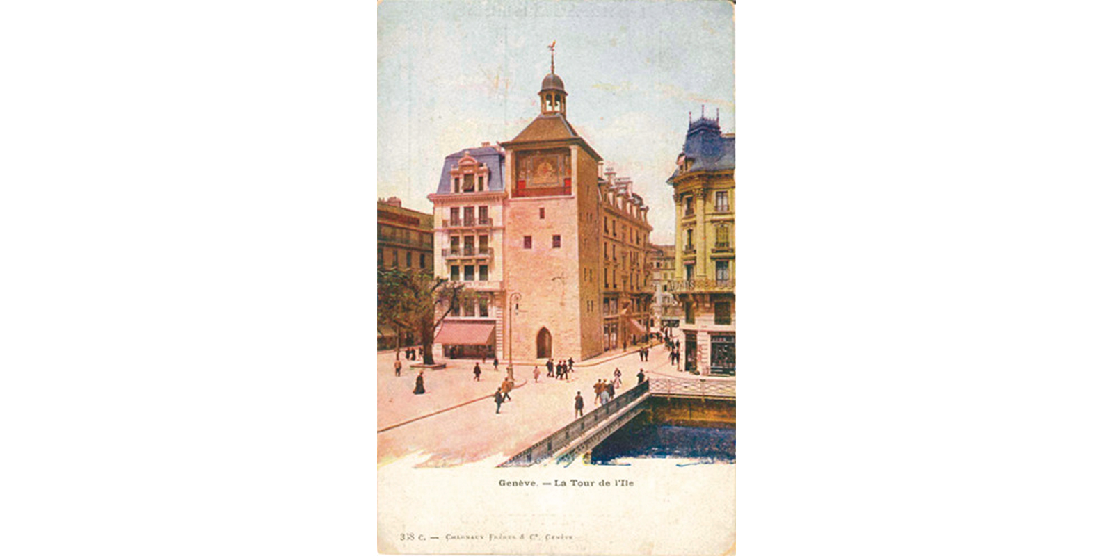 ジュネーブを象徴する歴史的建造物トゥール・ド・リル(左の建物)に入居。1875年、建築家ジャック=エリゼ・ゴスの設計による新社屋に移転するまで、拠点としていた。