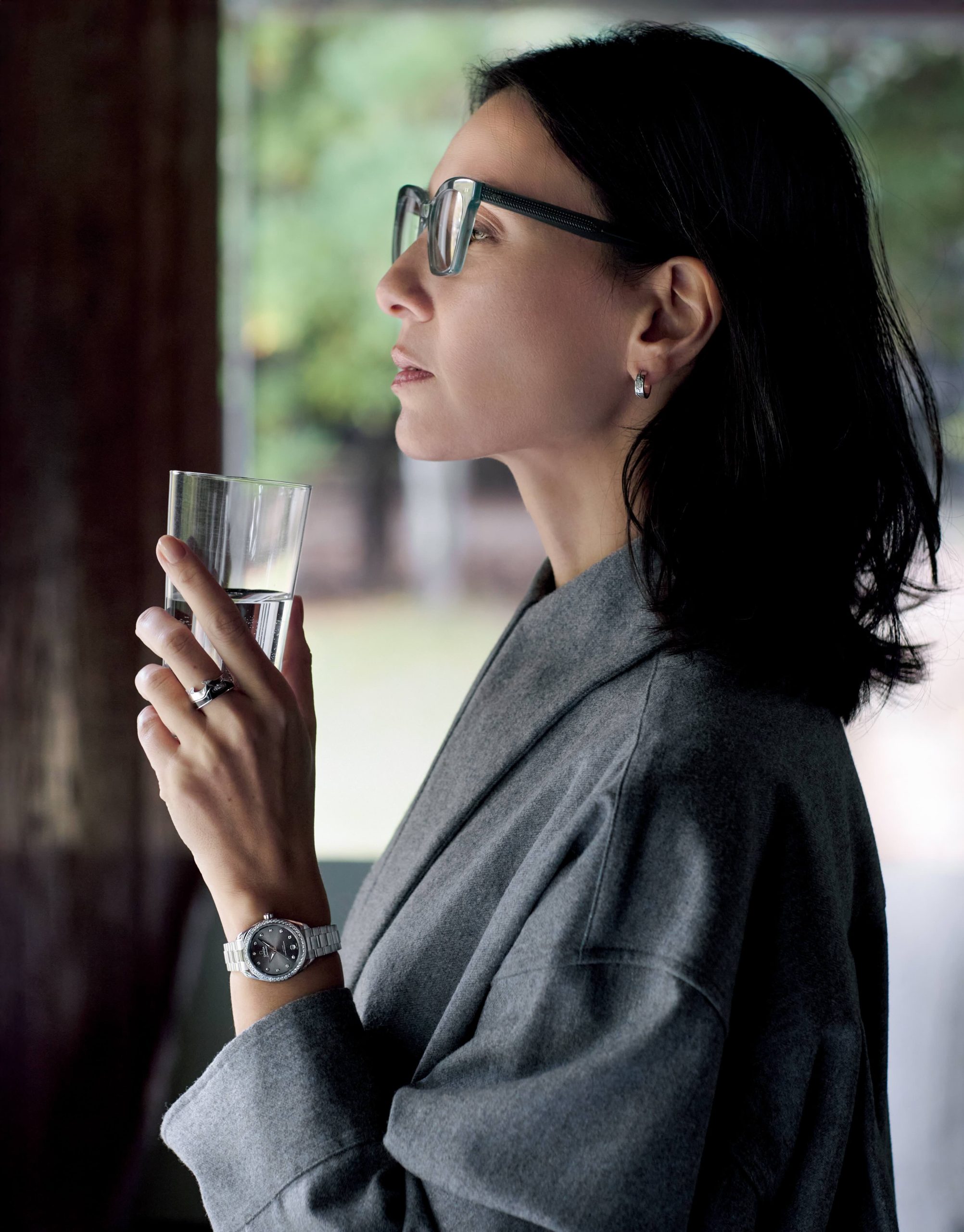 グレーの着こなしに煌めきとモダニズムを添えるクールなタイムピースの存在感