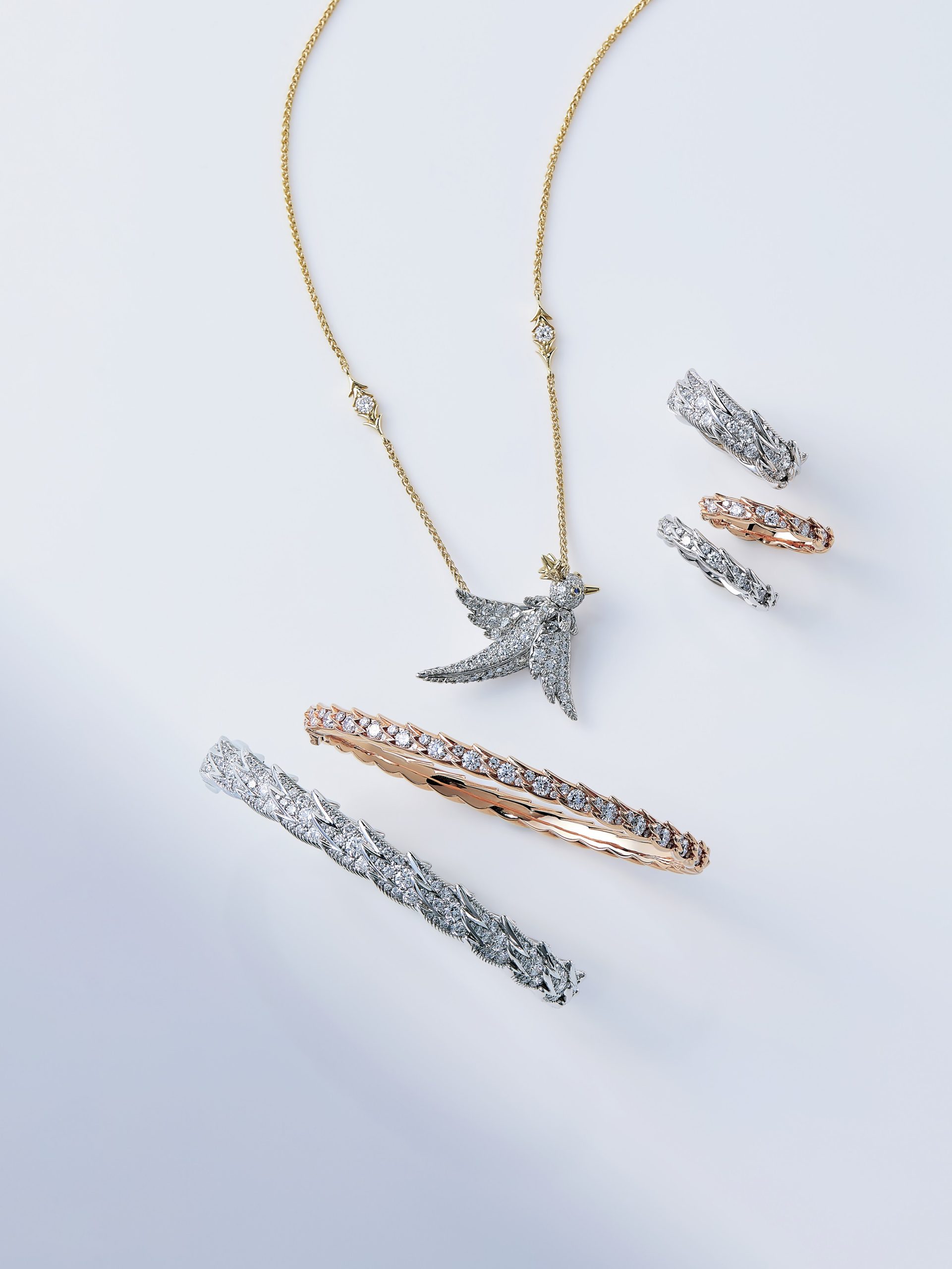 「バード」モチーフが、あらゆるシーンに似合う軽やかなジュエリーに。リングとブレスレットは、素材や幅をミックスした個性的な重ねづけを楽しんで。「バード オン ア ロック by ティファニー」リング〈上から〉「ウィングス ワイド リング」[ダイヤモンド×PT]¥3,410,000・「ウィングス ナロー リング」[ダイヤモンド×RG]¥1,375,000・同[ダイヤモンド×PT]¥1,419,000・ネックレス「バード ペンダント」[ダイヤモンド×PT×YG]¥3,410,000・ブレスレット〈上から〉「ウィングス ナロー バングル」[ダイヤモンド×RG]¥5,280,000・「ウィングス ワイド バングル」[ダイヤモンド×PT]¥8,965,000(ティファニー・アンド・カンパニー・ジャパン・インク)