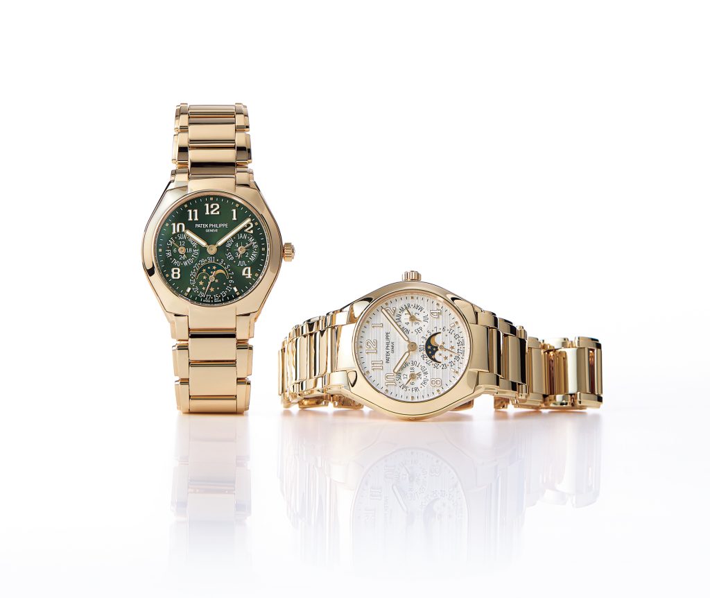 1999年の発表以来、現代社会を生きる女性に寄り添ってきたメゾン唯一の女性用腕時計のコレクション「TWENTY~4®」。2025年には、コレクション初のコンプリケーションである永久カレンダーが誕生した。特筆すべきは9.95㎜という驚異的なケースの薄さ! 超薄型自動巻きムーブメントを搭載することで、複雑機構時計特有の重厚さを感じさせない優美なフォルムが実現可能に。「TWENTY~4® 永久カレンダー」[ケース、ブレスレット:RG、ケース径:36㎜、自動巻き]〈右〉[文字盤:縦横サテン仕上げのシルバー]参考価格¥20,030,000・〈左〉[文字盤:オリーブグリーン・ソレイユ]参考価格¥20,030,000(パテック フィリップ)