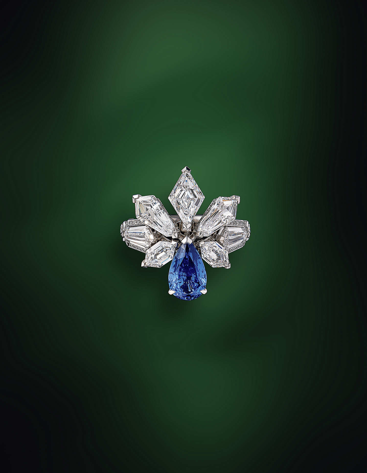 ローマ神話の女神に由来する「パルセ」と名づけられたリング。花を想起させるモチーフには、幾何学的なカットのダイヤモンドとペアシェイプのサファイアがセットされ、構築的なデザインをモダンに彩る。このリングは付属のダイヤモンドブレスレットとチェーンで繫いで楽しめる、トランスフォーマブルな仕様。「パルセ」リング[サファイア2.74ct×ダイヤモンド計8.11ct×PT、ブレスレットを付属]参考価格¥99,000,000(カルティエ)※ネックレス、イヤリングとのセット販売