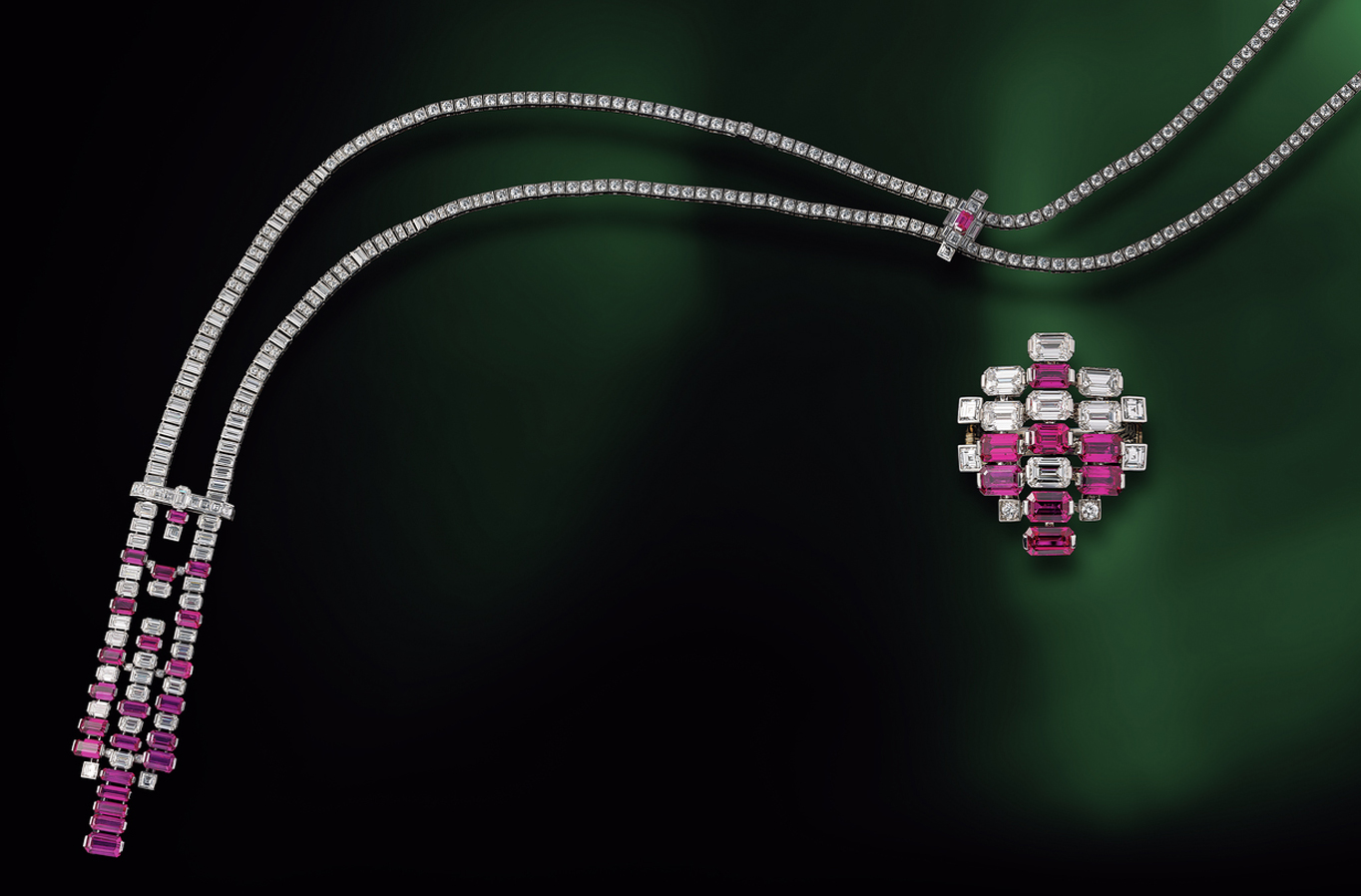 <右>エメラルドカットのダイヤモンドと角切りされたレクタンギュラーカットのルビーを、グラフィックに配置した抽象的デザインのリング。色鮮やかなルビーは、モザンビーク産の希少な非加熱が用いられている。あえてセッティングの間隔をあけることで、オープンワークのような効果が生まれ、宝石のモダンなフォルムと透明感が際立つ。「ユーフォニア」リング[ルビー計4.11ct×ダイヤモンド計4.42ct×PT]価格未定 ※ネックレスとのセット販売 <左>調和のとれた音の組み合わせを意味する「ユーフォニア」と名づけられたネックレス。それはシンプルに見えて、デザイン、宝石の選択、配置、セッティングのすべてにこだわり抜いた、本コレクションを象徴するピースのひとつ。ルビーは繊細な色味、非加熱の証しである内包物までも入念に精査して選ばれた。また、ネックレスは手のひらに収まるほどしなやかなつくり。背面のクラスプをスライドさせることで長さ調節ができる。細部に高度なサヴォアフェールが発揮された作品。「ユーフォニア」ネックレス[ルビー計19.69ct×ダイヤモンド計33.49ct×PT]参考価格¥343,200,000(カルティエ)