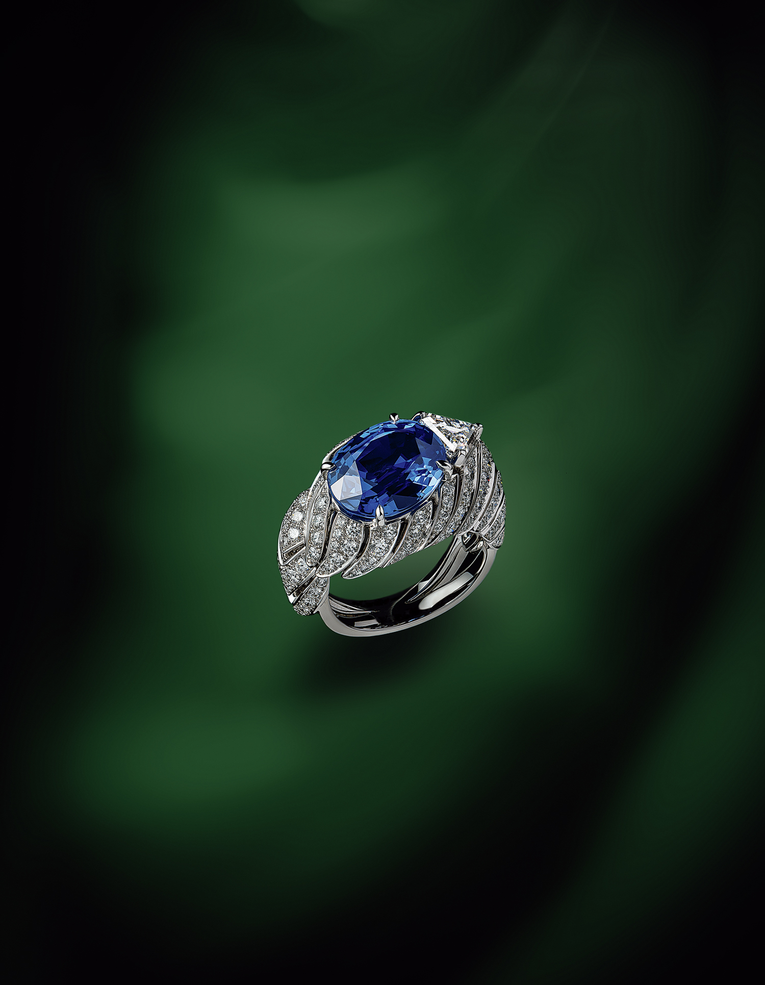 西洋アサガオの葉をモチーフにしたリング。葉脈が繊細な透かし彫りで表現され、流れるように指を取り巻く。正面で輝くマダガスカル産のサファイアは、まさに一輪の花を思わせる美しさ。このサファイアは古い鉱山から採掘された希少な石で、紫がかった繊細な色彩が魅力。その横にはトリリアントカット(三角形)のダイヤモンドが煌めき、有機的なデザインに緊張感と洗練をもたらす。「シエル イポメ」リング[サファイア7.29ct×ダイヤモンド計2.80ct×PT]参考価格¥115,500,000(カルティエ)※イヤリングとのセット販売