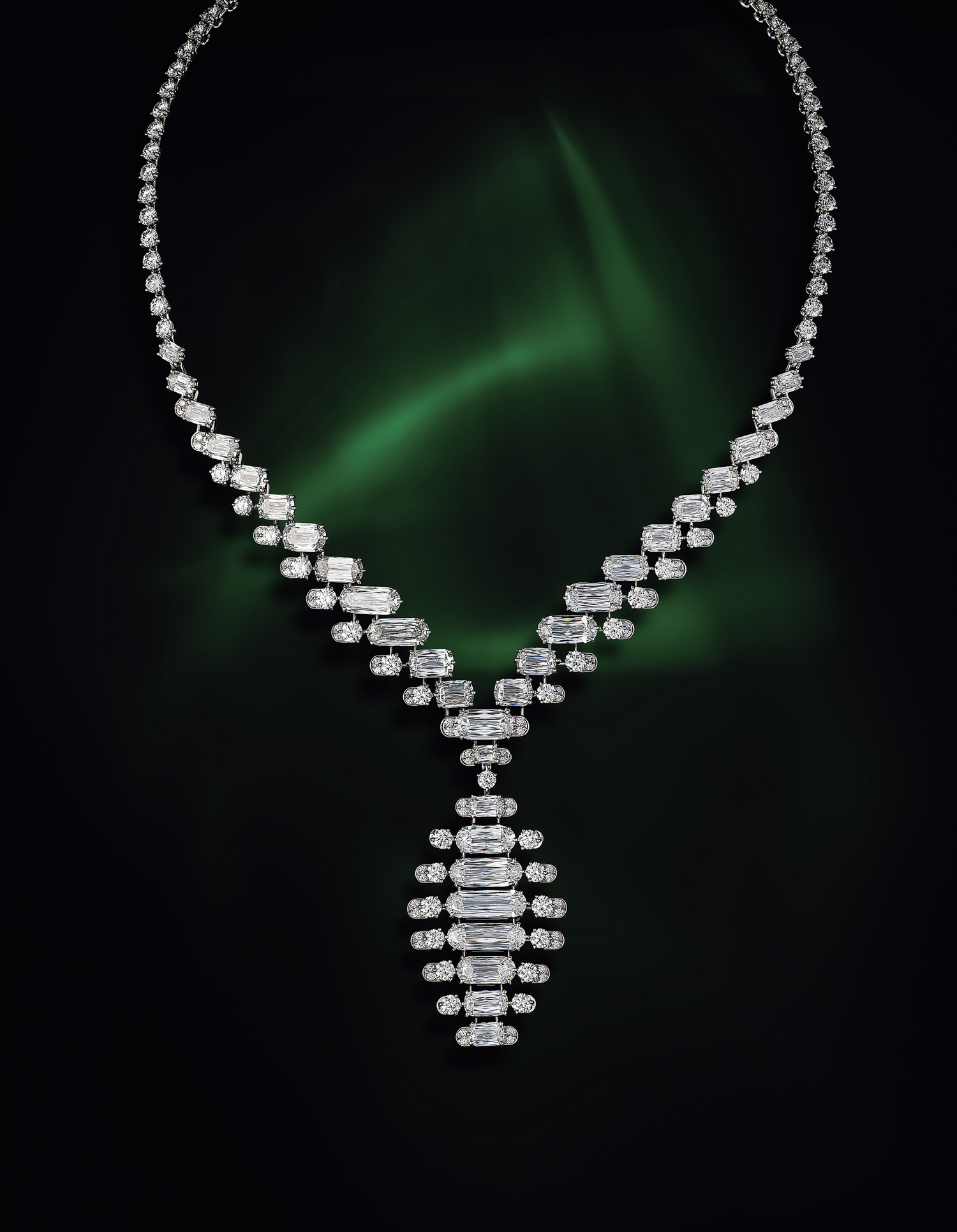 ダイヤモンドを光のラインと捉え、精緻かつリズミカルに配した、コンテンポラリーな美しさが際立つネックレス。石を繫ぐ接合部のパーツは、正面からはほぼ見えない精巧なつくり。この高度な宝飾技巧によって、ダイヤモンドが肌の上に浮かび上がって見える。極細の爪で石留めができるプラチナを用いたことも、本作の完成度を飛躍的に高めたポイント。「スプレンデア」ネックレス[ダイヤモンド計30.20ct×PT]参考価格¥364,320,000(カルティエ)