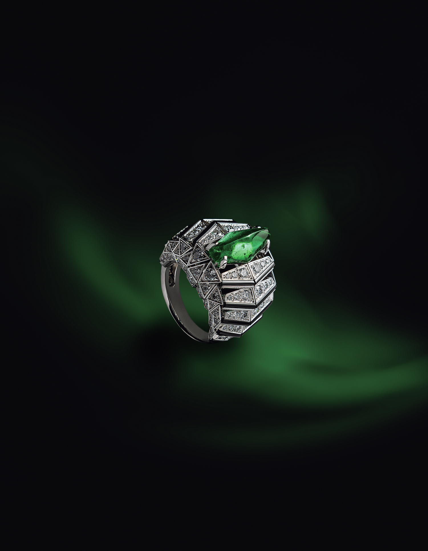 オニキスのラインで際立つ、独創的な菱形のエメラルド