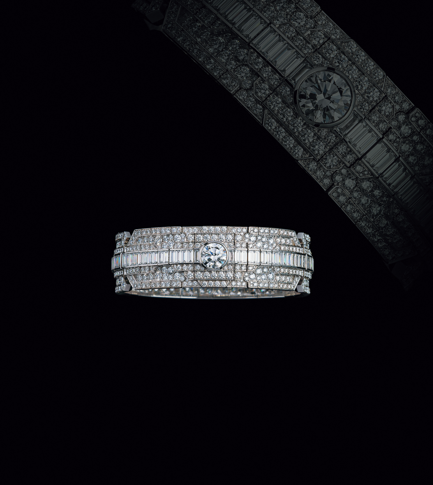 「アドレス(ヴァンドーム)」の章が讃えるのは、この地の可能性を見抜いた創業者の先見性と勇気ある決断です。広場を俯瞰する八角形のモチーフは、ブラックラッカーの輪郭とダイヤモンドの輝きによって、現代的なモノクロームの美へと昇華。本章を象徴する「タイプⅡa」ダイヤモンドの澄みきった輝きが、最良の光を求めてこの場所を選んだ彼のたぐい希な審美眼を物語ります。