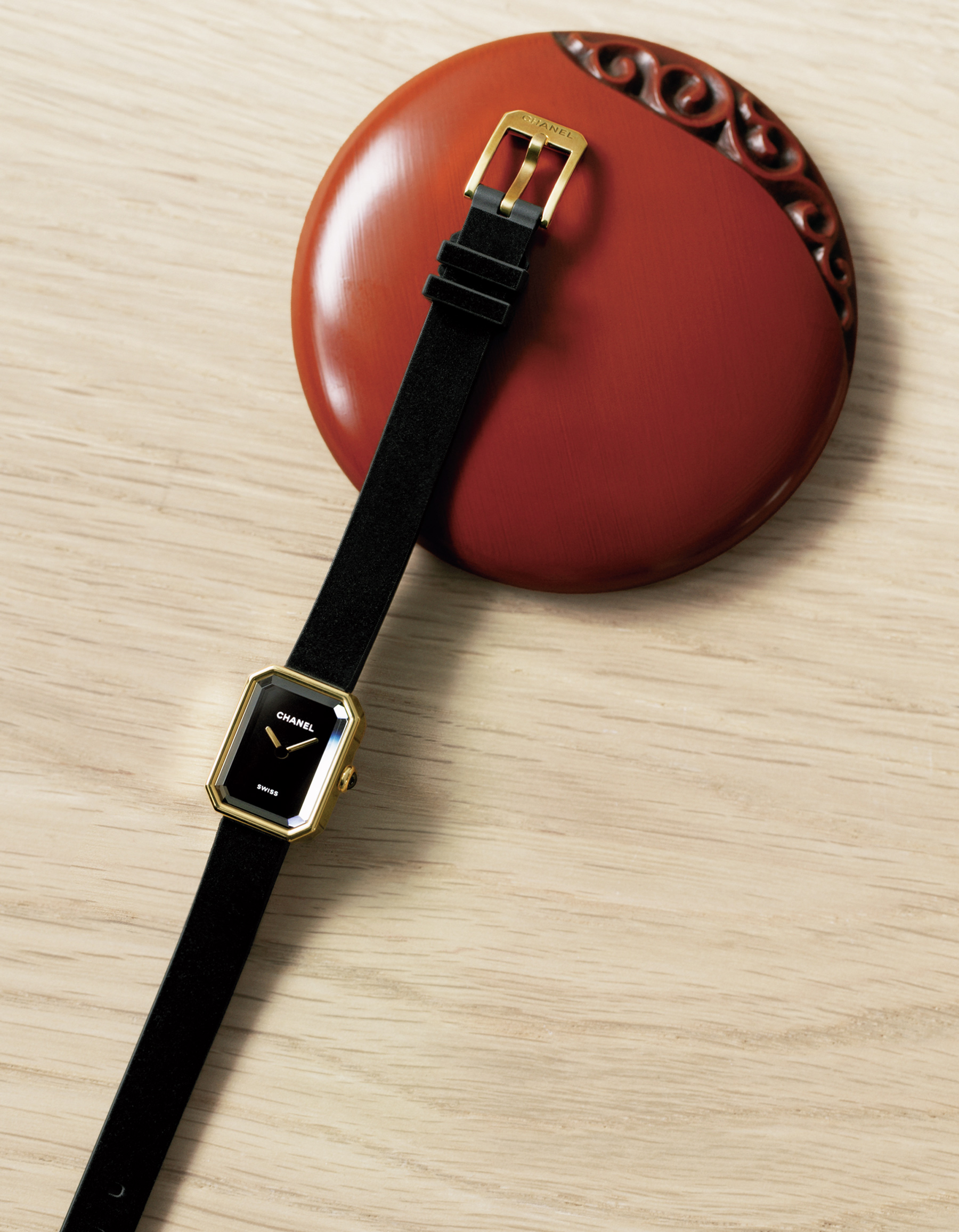 インデックスを配さず、時分針とロゴのみという文字盤から生まれる引き算の美学。チタン製裏蓋のイエローゴールドケースは驚くほど軽やかで手首にフィットし、まるでヴェルベットのような感触のストラップとあいまって、和の装いに極上のモダニティをもたらす。[ケース:YG×TI、ケースサイズ:縦19.7×横15.2㎜、ストラップ:ヴェルベットタッチのラバー、クオーツ]¥951,000(シャネル)
