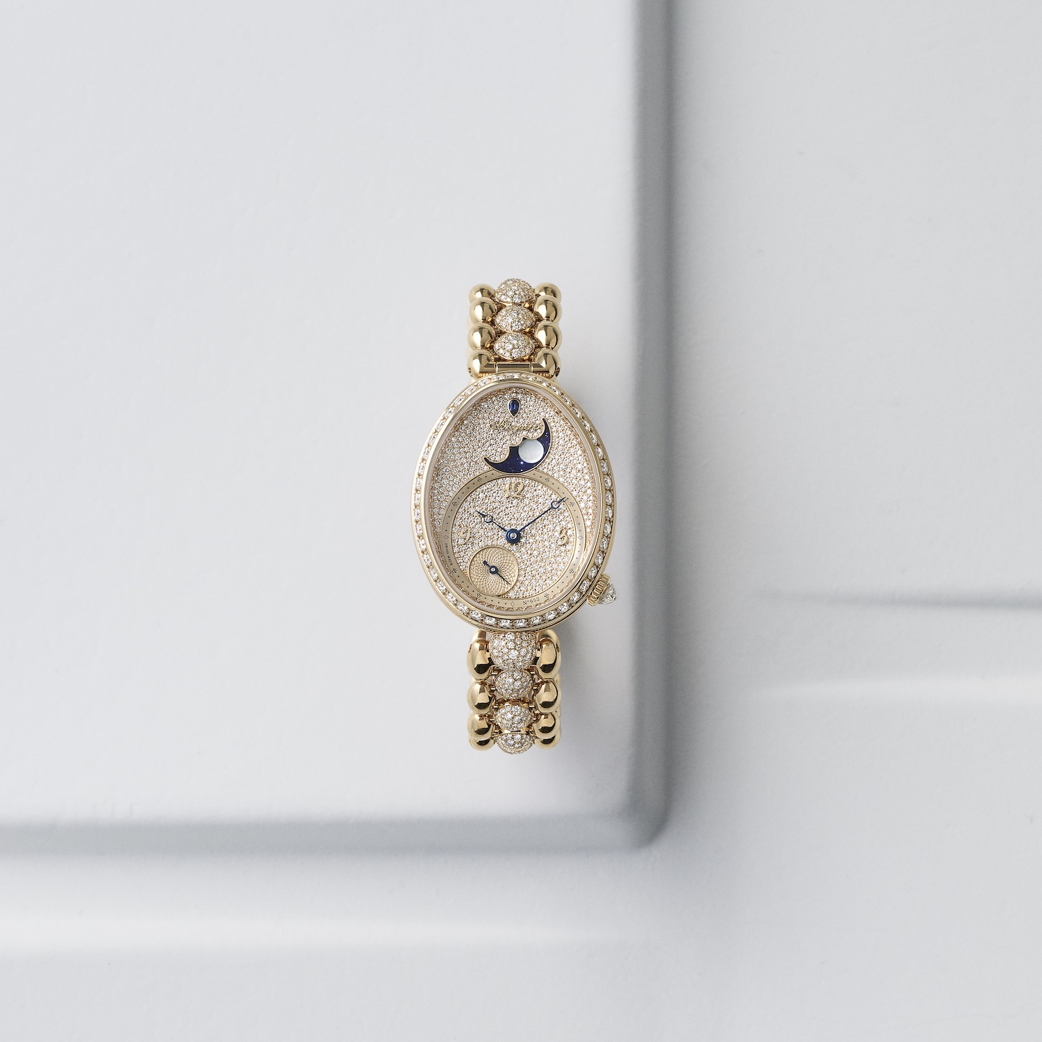 まるでセカンドスキンのように手元を軽やかに彩る、オールゴールドで仕上げた「レーヌ・ドゥ・ナープル 8925」。独自のブレゲゴールドを採用することで、モダンかつ上品な印象に。サンレイ仕上げの文字盤にはオフセンターダイヤルに手彫りでギョーシェが施されていて、同じゴールドでありながらも多彩な表情が楽しめる仕上がりになっています。ブリオレットカットのダイヤモンドをリューズにさりげなくあしらっているのも印象的。