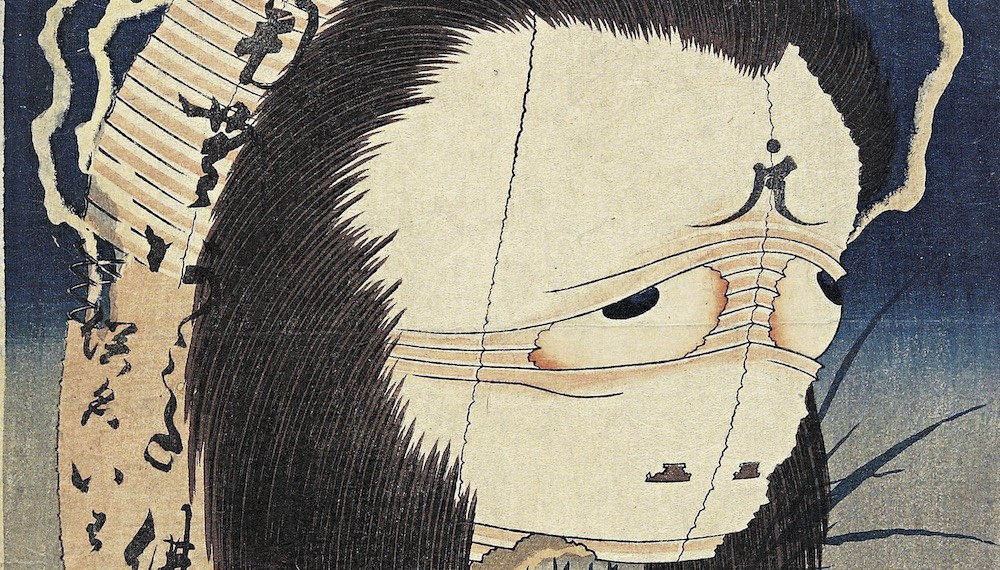 The image below is an ukiyo-e print from the series, One Hundred Ghost Stories, which was produced in the same period as the Thirty-six Views of Mount Fuji series. It portrays the ghost of Oiwa from the Tokaido Yotsuya Kaidan, a famous kabuki theater play about betrayal, murder, and the supernatural. In the ghostly tale, Oiwa’s face becomes disfigured after her husband’s lover gives her poisoned face cream, and after her death, Oiwa’s ghastly face often appears to haunt her husband. Hokusai’s touch can be seen in the amusing charm that he bestowed Oiwa in his depiction of her as a paper lantern.