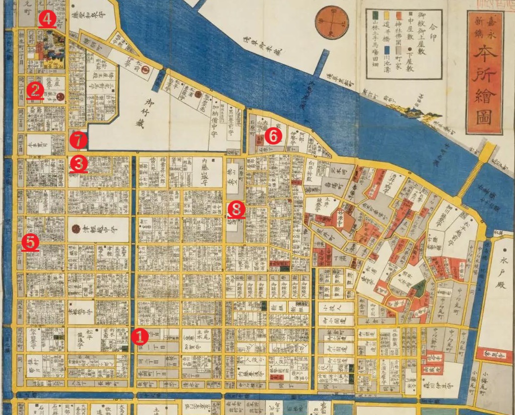 1.誕生の地、本所割下水 2.幼少期を過ごした松坂町 3.49歳、83歳、88歳のころに住んだ亀沢町 4.50歳のころ住んだ両国橋近辺 5.61歳のころ住んだ緑町 6.80歳のころ住んだ石原片町 7.81~85歳を過ごした榛馬場(はんのきばば) 8.86歳のころ住んだ石原町 地図のエリア以外にも、浅草界隈、九段下(くだんした)、錦糸町(きんしちょう)、清澄白河(きよすみしらかわ)などに住んでいたことが確認されている。『江戸切絵図・本所絵図(えどきりえず・ほんじょえず)』景山致恭、戸松昌訓、井山能知 尾張屋清七 嘉永2~文久2(1849~1862)年 国立国会図書館デジタルコレクション https://dl.ndl.go.jp/pid/1286679 (参照 2025-06-07)