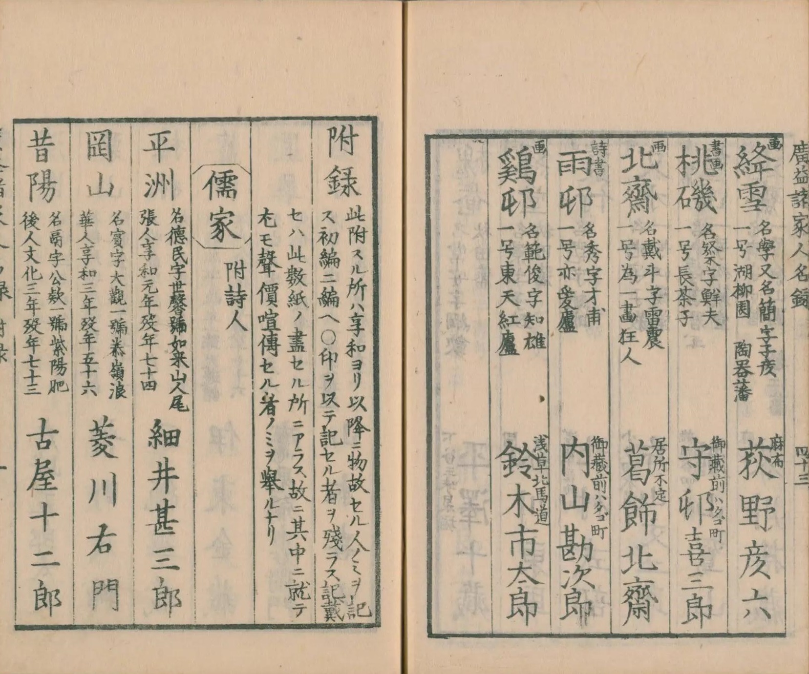 右ページの3番目に書かれた葛飾北斎の名の右側に「居所不定」の文字が見える。『広益諸家人名録(こうえきしょかじんめいろく)』西邨[宗七] 編 須原屋佐助 天保7(1836)年 国立国会図書館デジタルコレクション https://dl.ndl.go.jp/pid/2543329 (参照 2025-06-07)