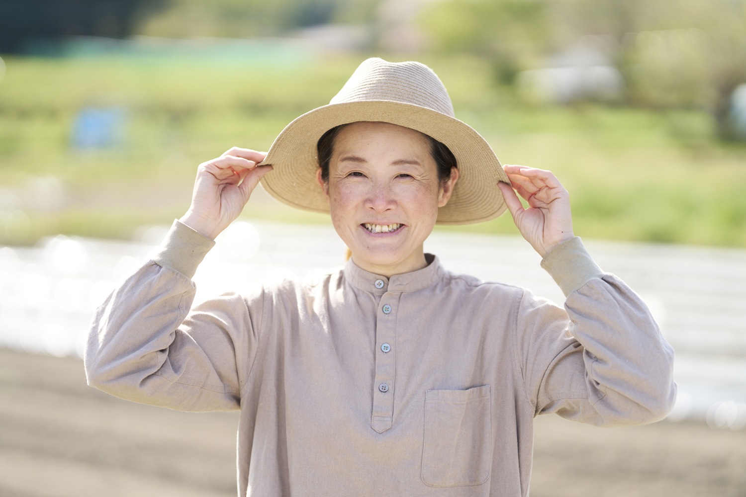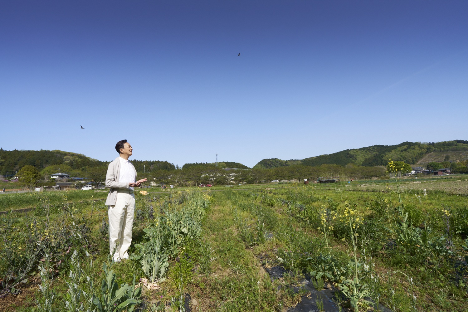 前日まで雨天続きだったのに、農園を訪れたこの日は奇跡的な晴天! 玉三郎さんが瑞々しい畑に立った瞬間、出迎えてくれるかのように燕たちが頭上をぐるぐると舞い、蝶たちがひらひらと羽ばたきました。これは無農薬の畑の証しですね。