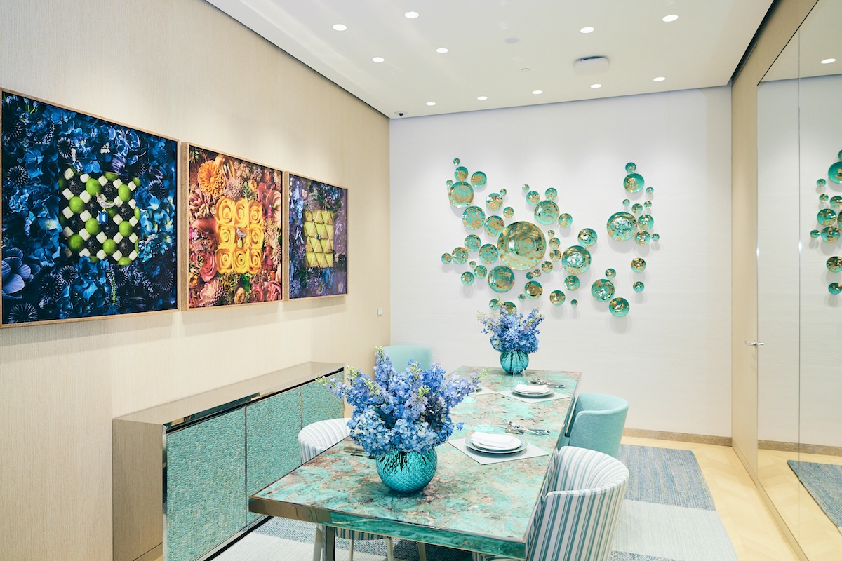 ジャンルを超える挑戦のひとつとして、店内の個室には特別なアートが。『バード オン ア ロック』をはじめとする“ティファニー”のハイジュエリーが、庄司さんが制作するボックスケーキの上にあしらわれた写真が飾られています。そしてケーキの周りを囲むのは、東さんのフラワーアート……!