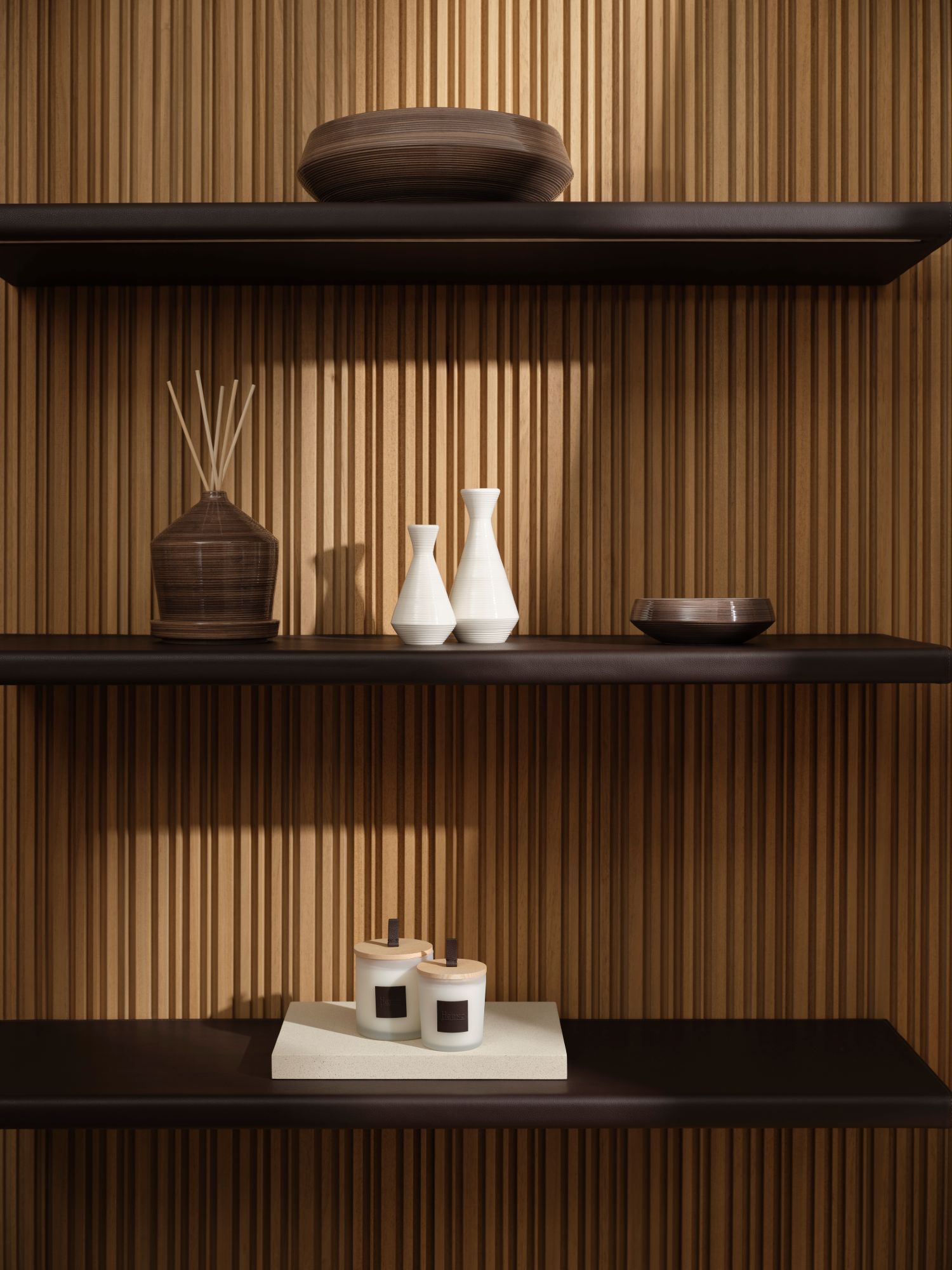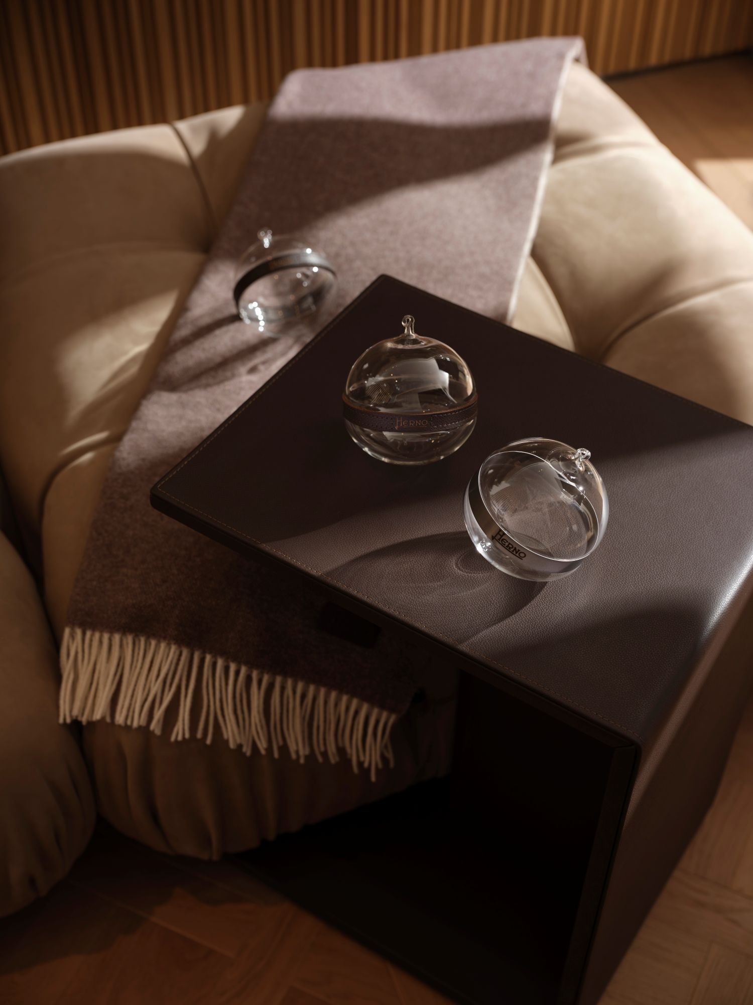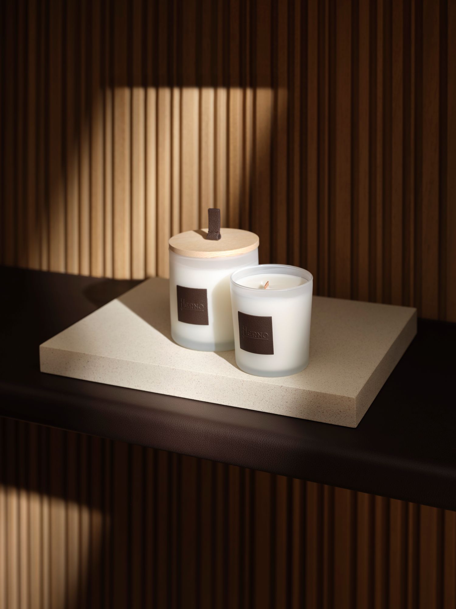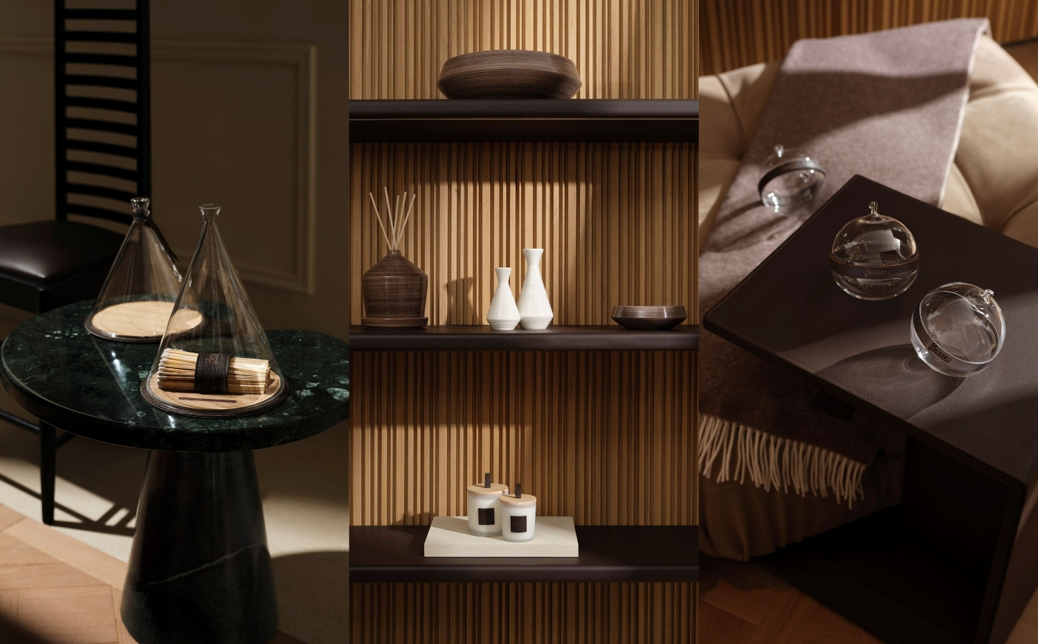 「ヘルノ・アビタ」の序章を飾るのはホームフレグランス。木や革のディテールをあしらったディフューザーやキャンドルが、ヘルノらしい世界観を日常に届けます。洗練された香りはヘルノの象徴となり、空間にそっと寄り添いながら、ふとしたひとときを優雅に彩ります。