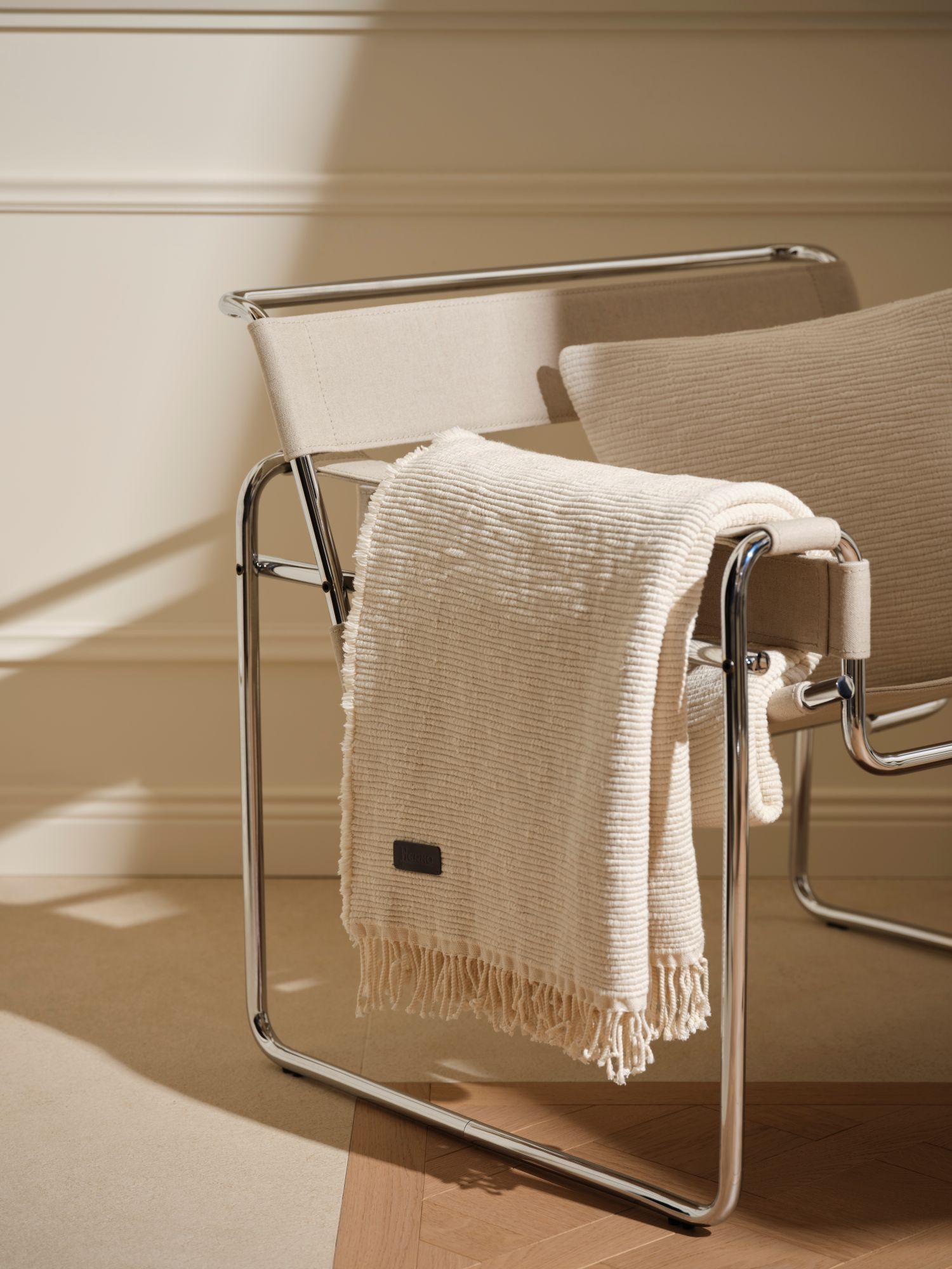 カシミア混メリノウールやコットンを用いたブランケットやクッションは、快適さと洗練を兼ね備えたテキスタイルライン。ジャケットに使われるレザーラベルやボタンのディテールを取り入れることで、服とインテリアをつなぐアクセントに。素材へのこだわりをそのままに、日常の風景へ自然に溶け込み、心地よい時間をもたらします。
