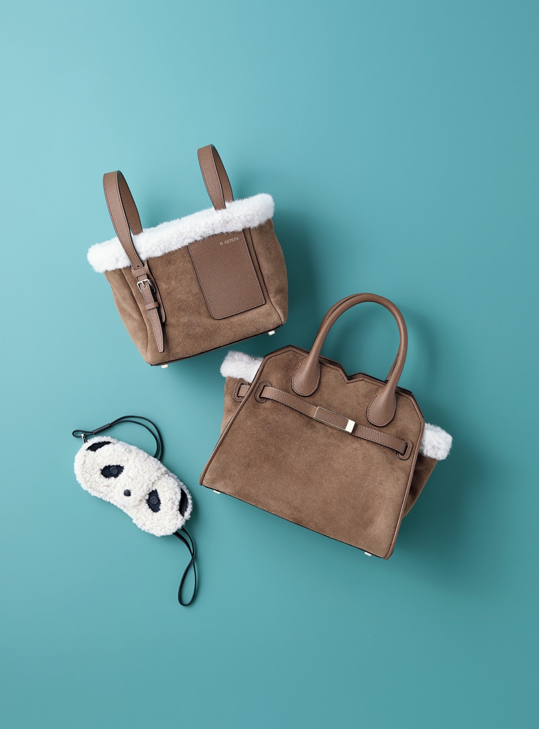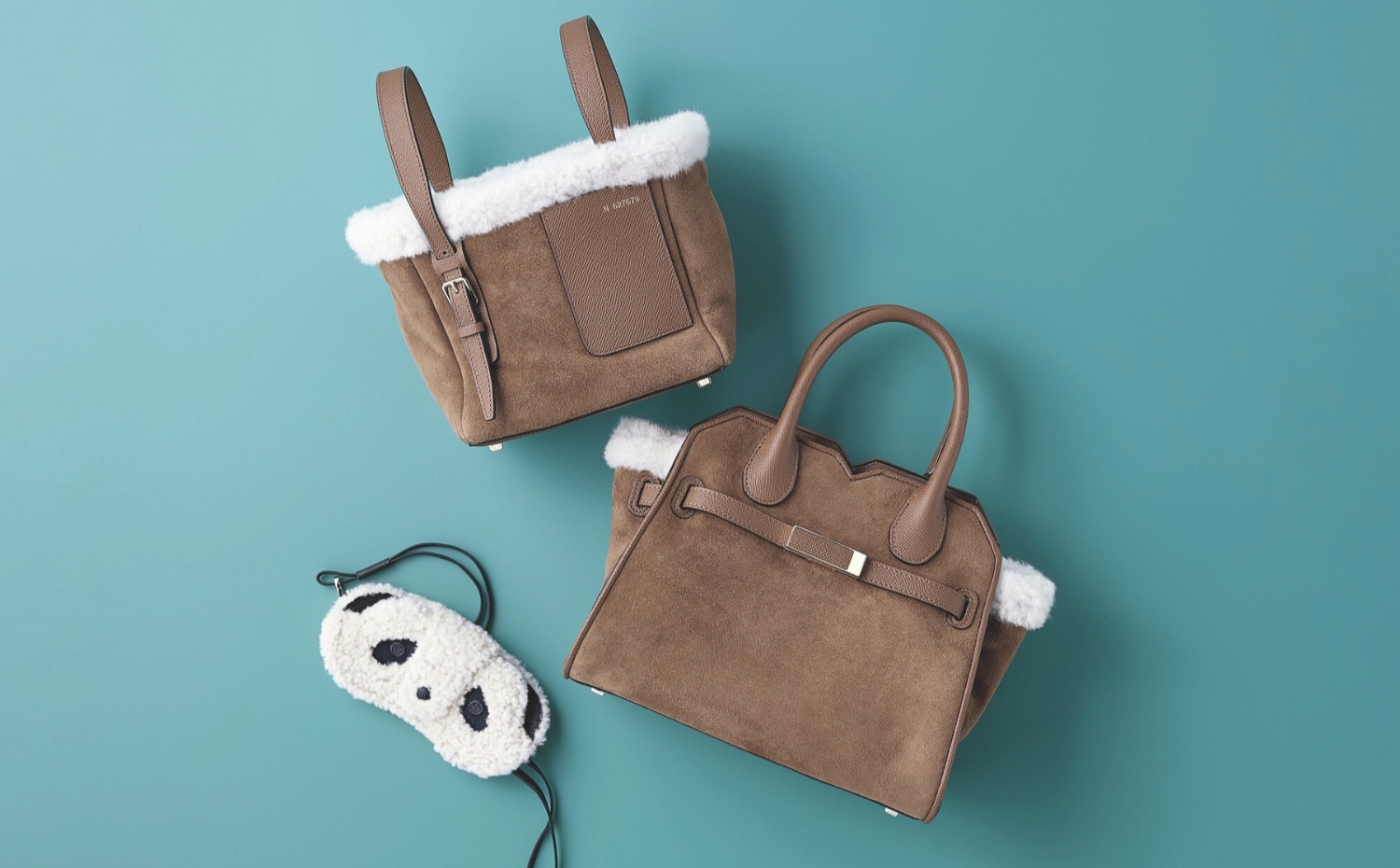 上から/ストラップを付けてクロスボディにしても。「バケットバッグ マイクロ シアリング」[縦16×横18×マチ13㎝/ストラップ付き]¥330,000・職人技が光るエレガントなデザイン。「2ハンドル ミラノバッグ ミニ シアリング」[縦22×横26×マチ14.5㎝/ストラップ付き]¥704,000・パンダのほかにベアも展開。「シアリング ストラップ付き メガネケース パンダ」[縦8×横16.5×マチ1㎝]¥115,500(ヴァレクストラ ジャパン)